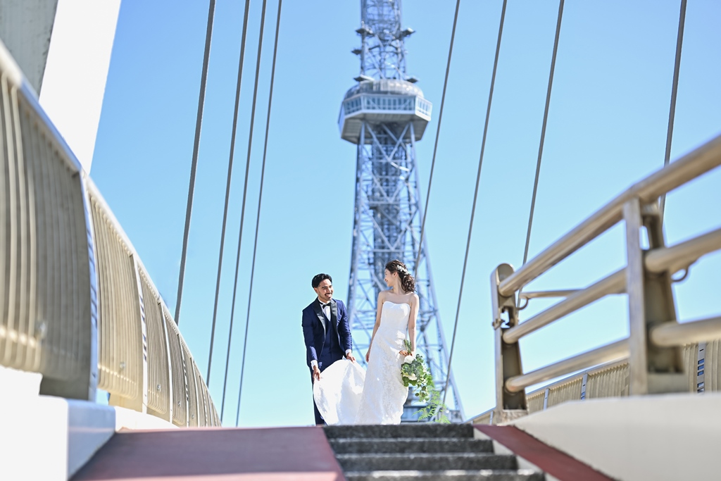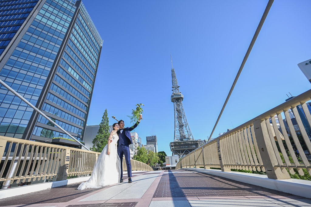 栄の中心にある高い高い、テレビ塔を背景にウェディングドレスとタキシード姿のお二人が映える♡