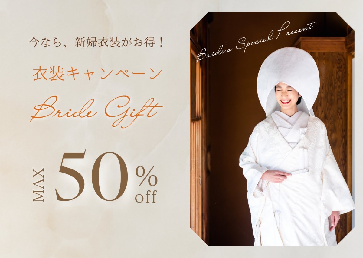 新婦様のお衣装が、(ウェディングドレス・カラードレス・色打掛・白無垢)最大50%OFFに!