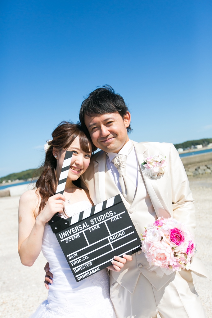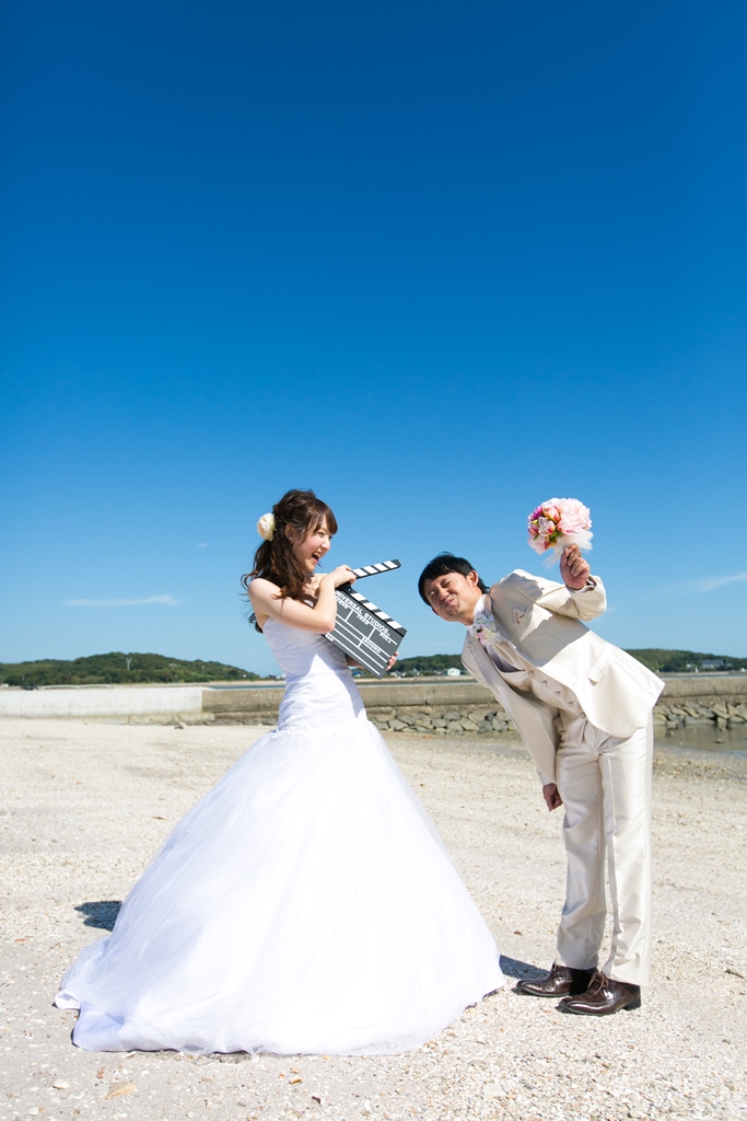 青空と海の前で、迫力あるウェディングフォトを!