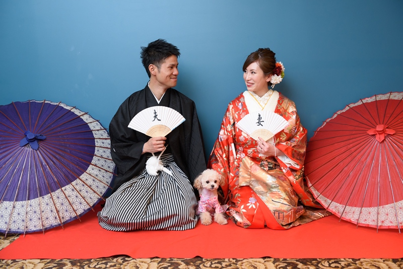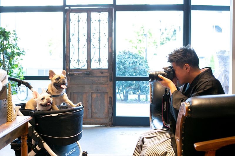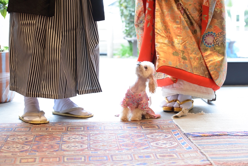 愛犬を撮影する紋付き姿の新郎様