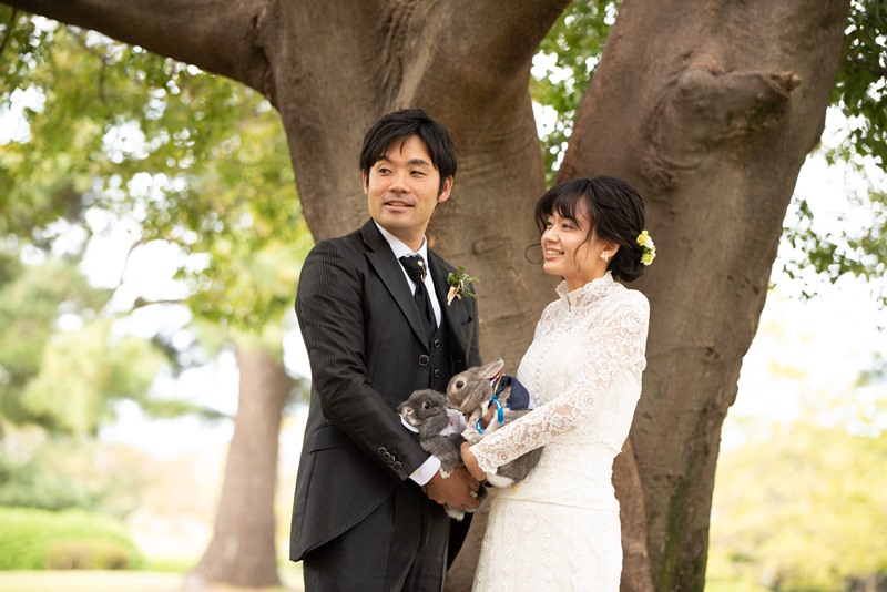 ウェディングすがたのお二人の足元にはうさぎ♡