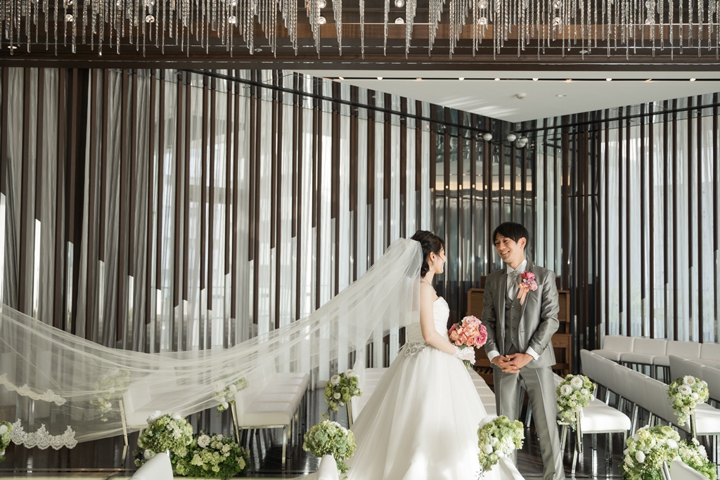 手をとりおでこを合わせヴェールをなびかせる新郎新婦