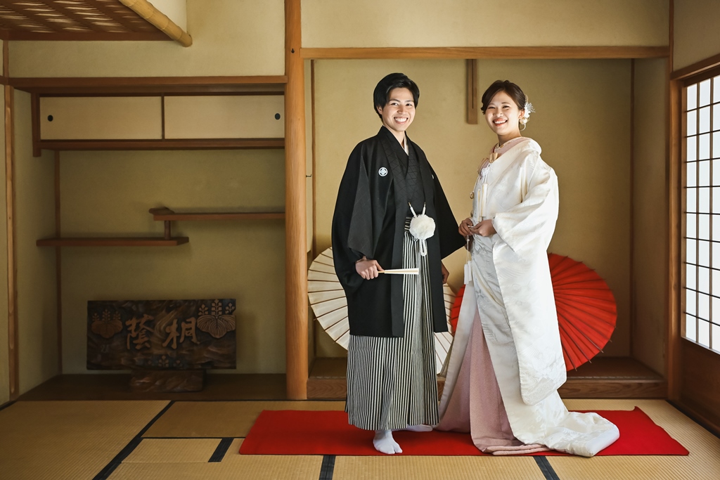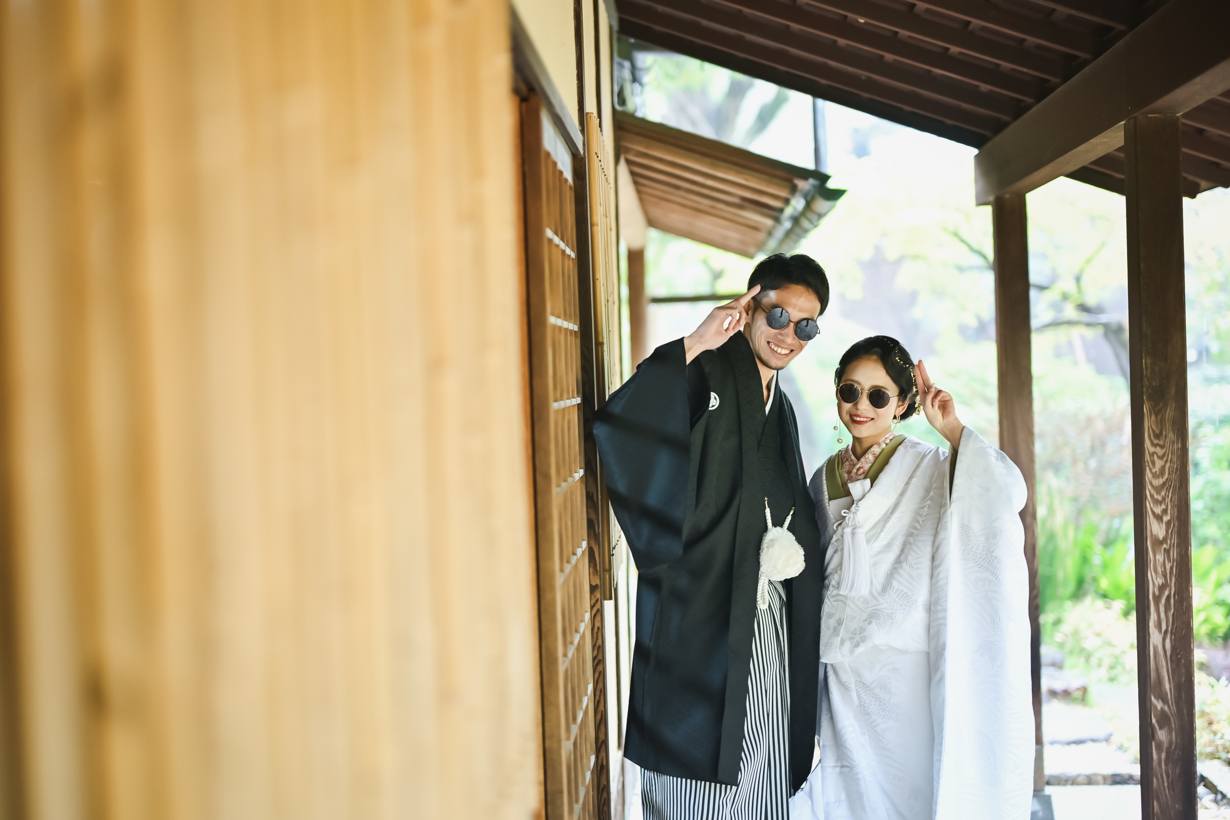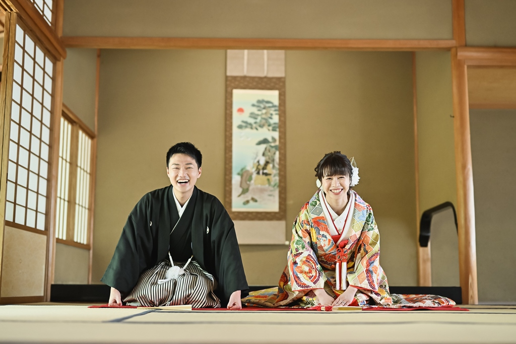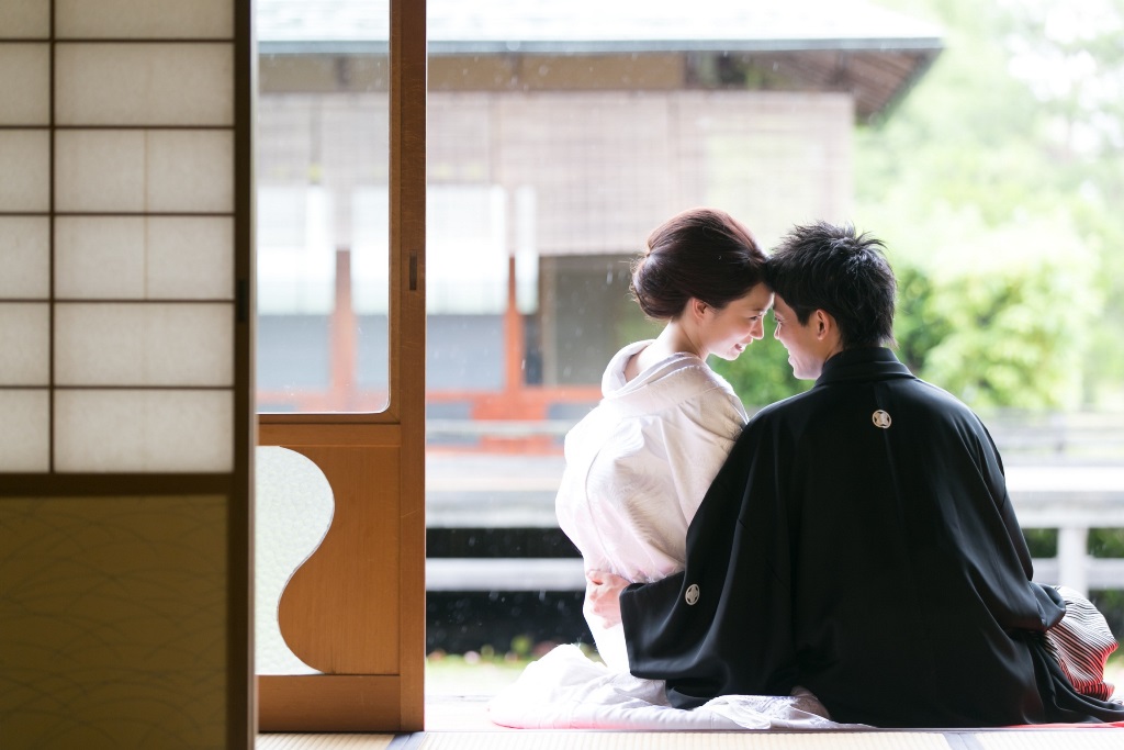 雨の日の和室で撮影する結婚写真には、穏やかな趣と深い風情があります。