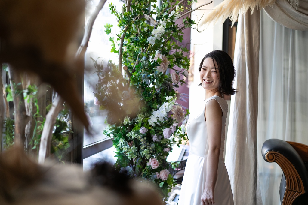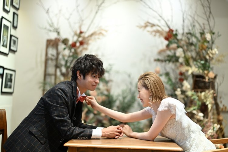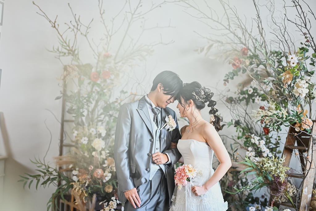 ドライフラワーやアンティーク家具などで装飾された大人オシャレなアトリエスタジオでは、クラシカルな雰囲気の写真に仕上がります。
