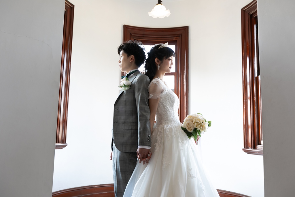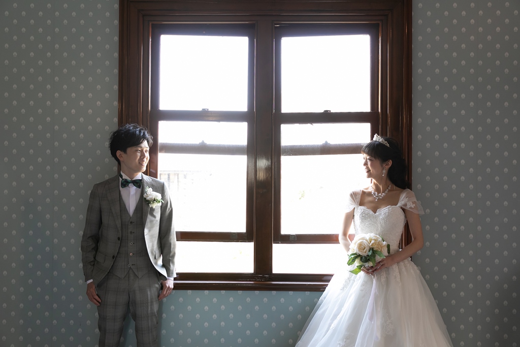 窓際両サイドでお互いを見つめながら立つ新郎新婦
