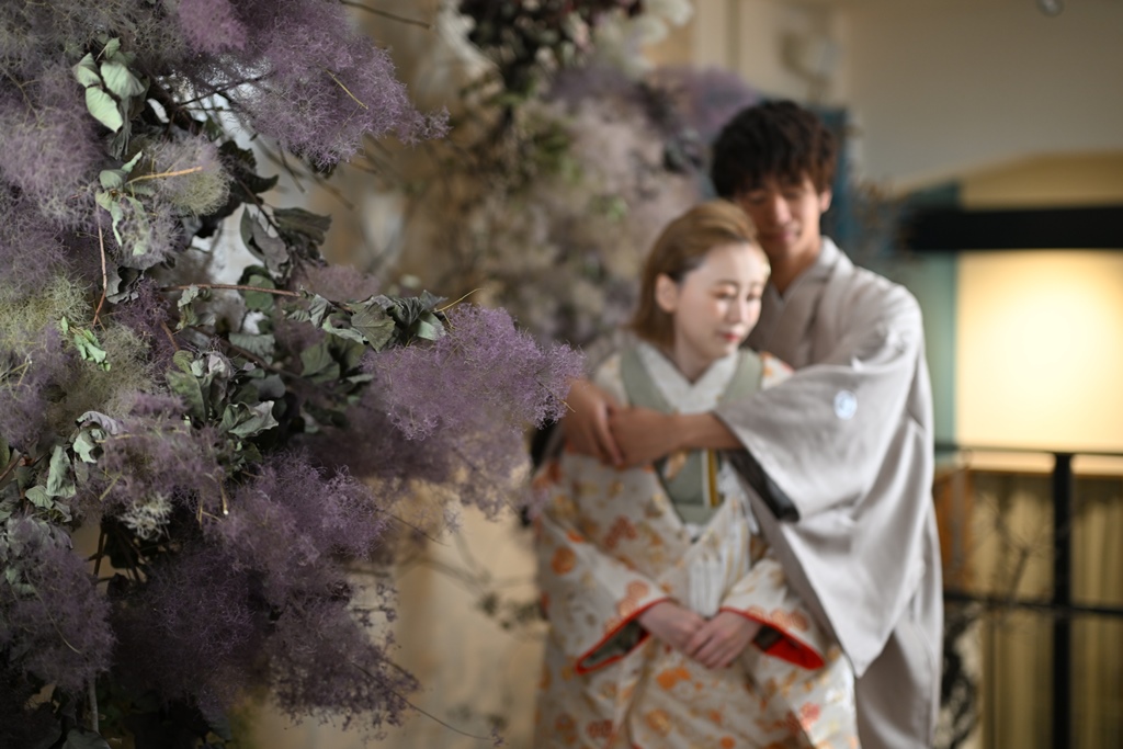 ドライフラワーの前でおでこを合わせる新郎新婦