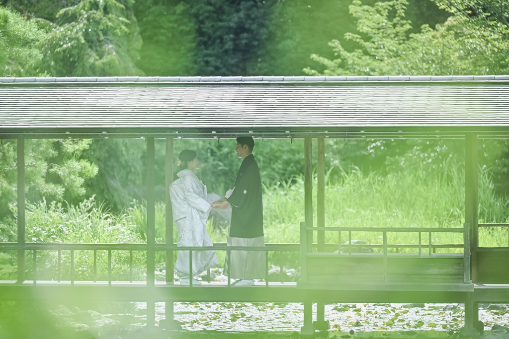 鳥居や池や橋などのフォトスポットもある和装でのウェディングフォトには最適なロケーション!