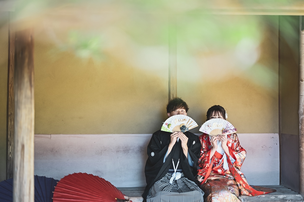 扇子で顔を隠しながら縁側に座る新郎新婦