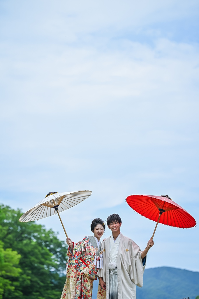 和傘や小物を使って、お二人の素敵な写真をお任せください(^▽^)/