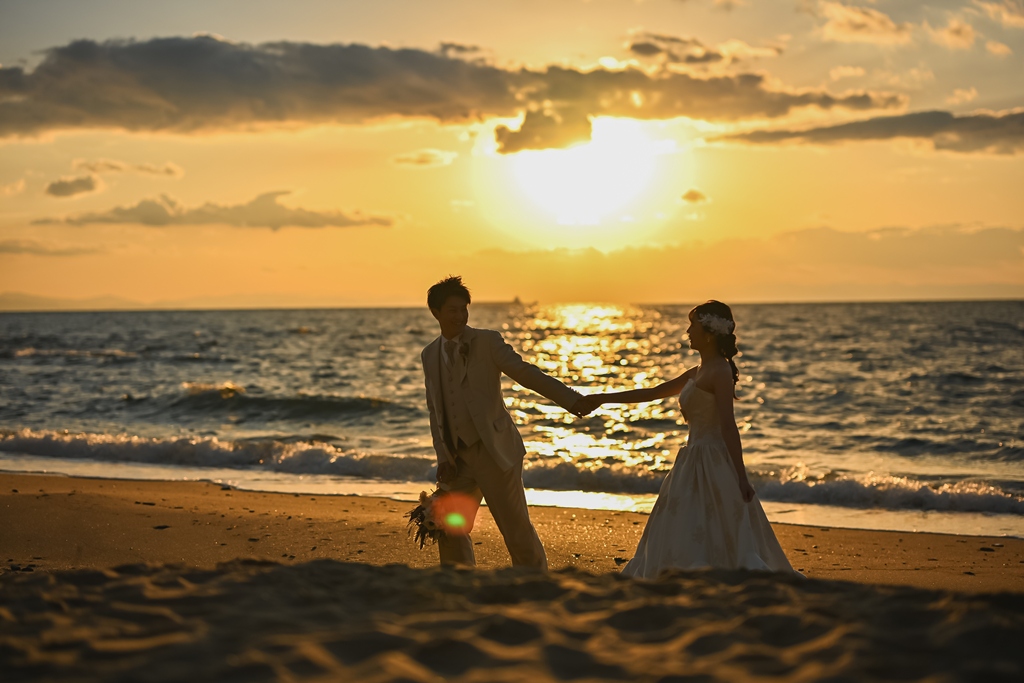 金色は豊かさや明るい将来を意味することもあり、お2人も夕日に照らされて輝く姿は、