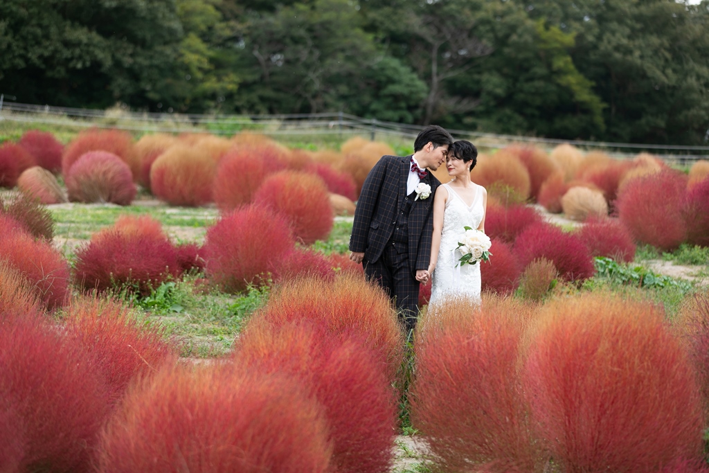 まず初めにご紹介するスポットは、コキアのお花畑での撮影!