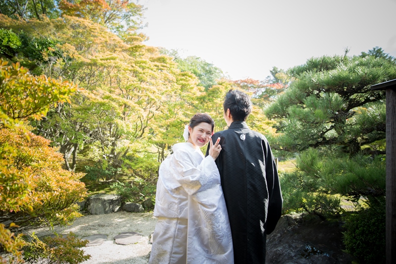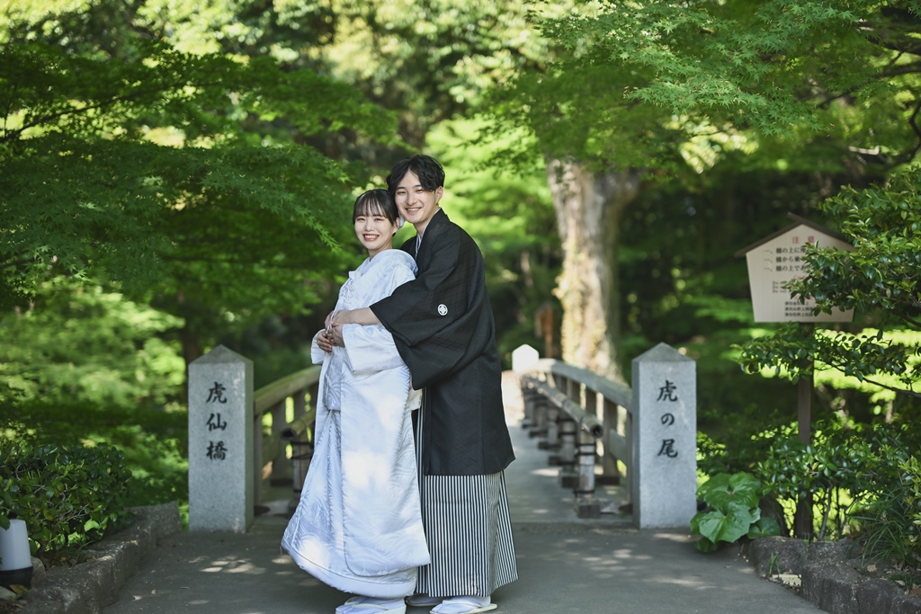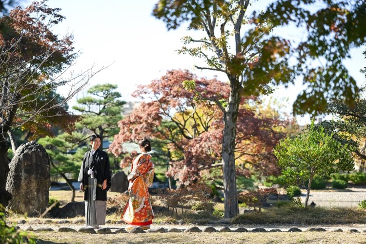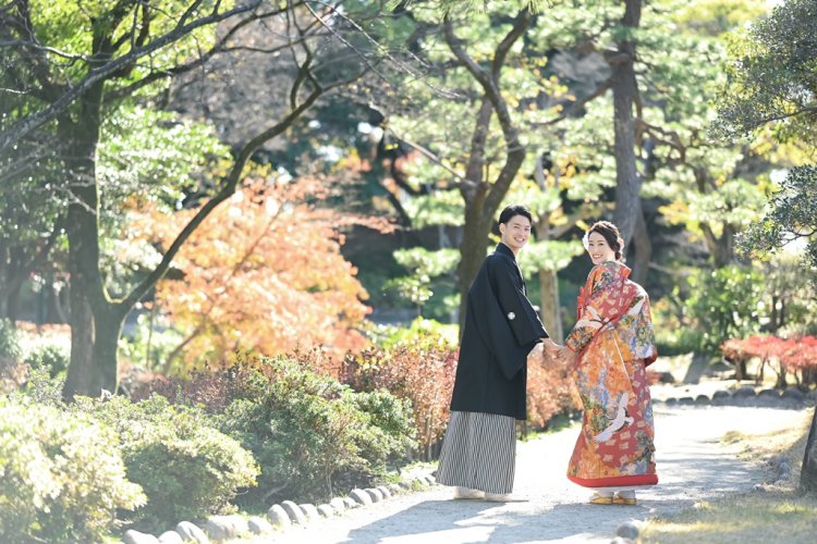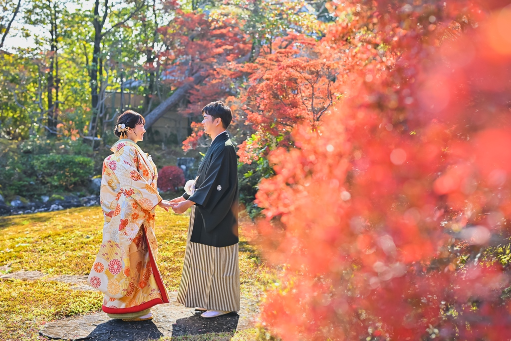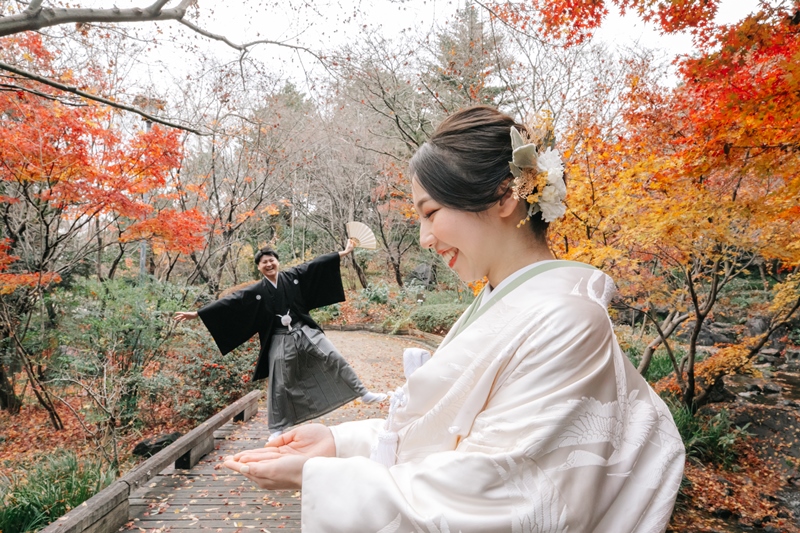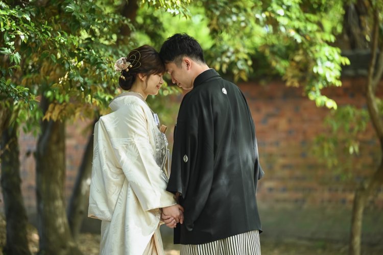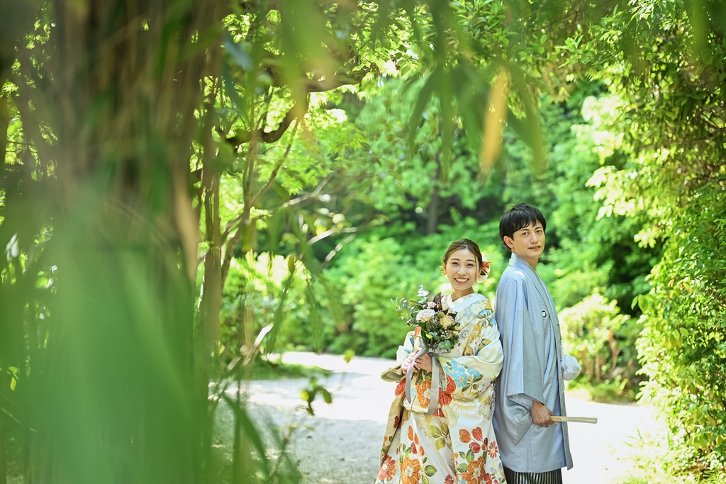 庭園での結婚写真は、自然の彩りと和装の華やかさが調和し、一生の思い出となる特別な一枚に。