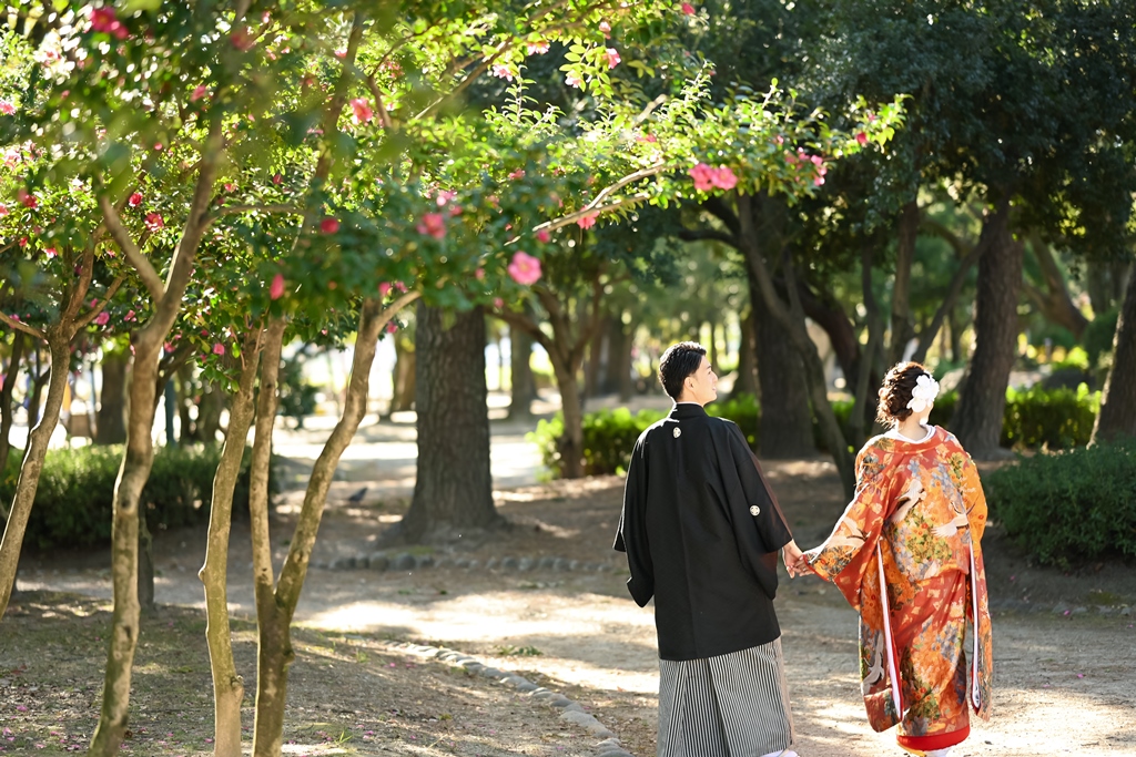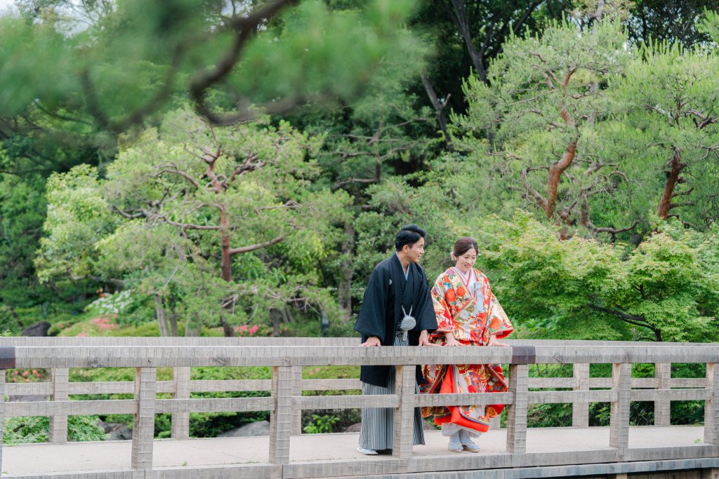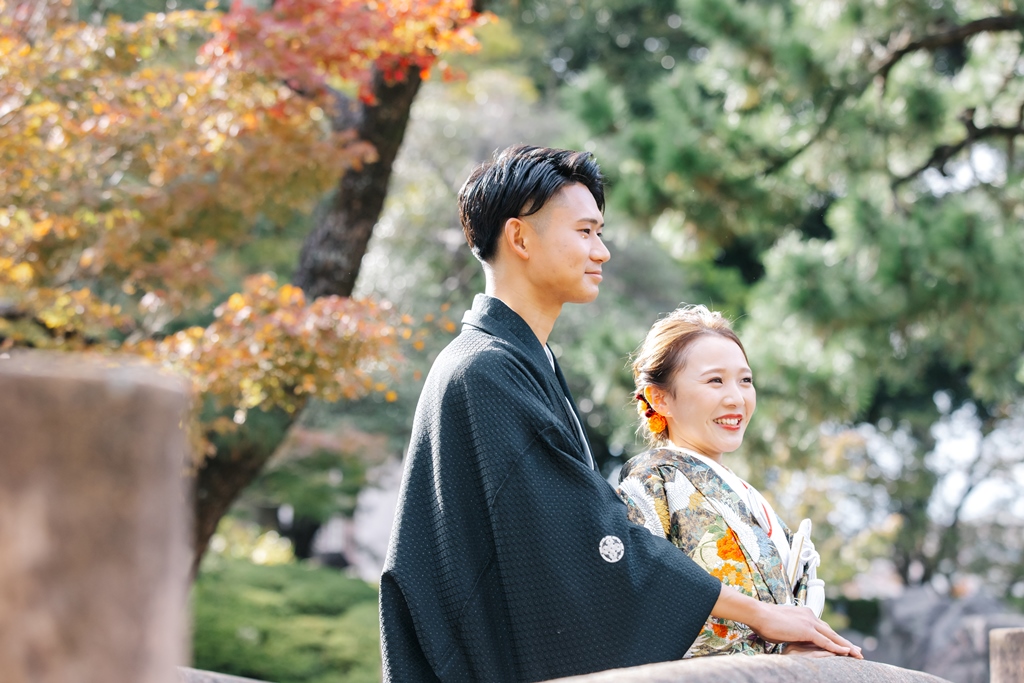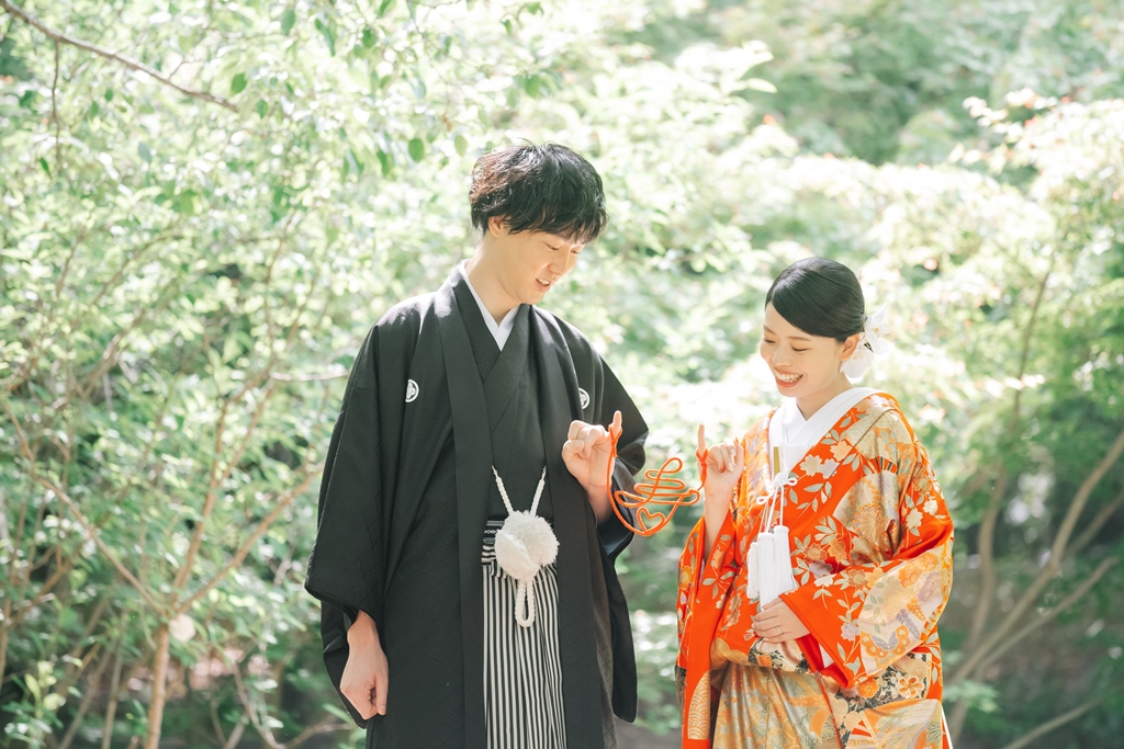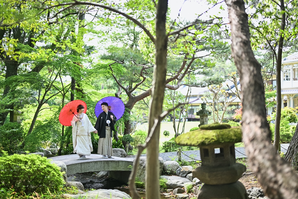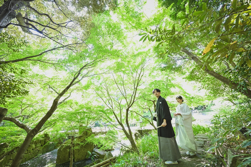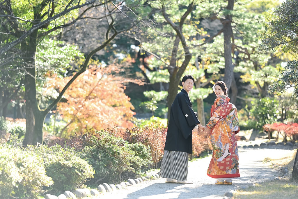 庭園での結婚写真は、自然の彩りと和装の華やかさが調和し、一生の思い出となる特別な一枚に。