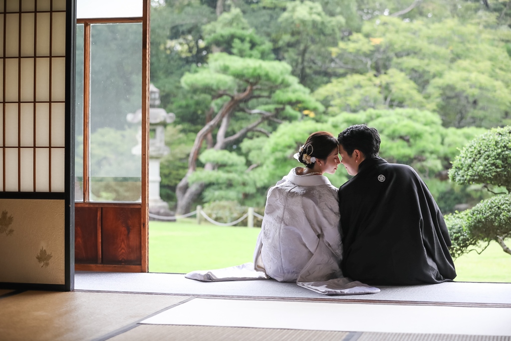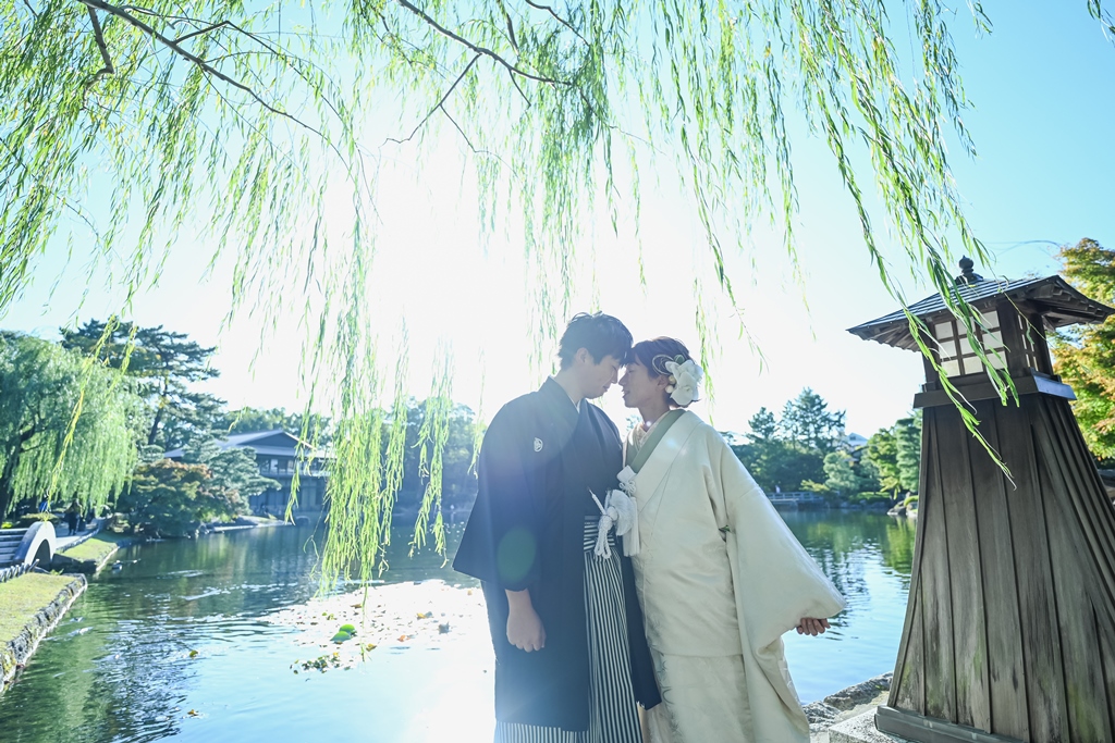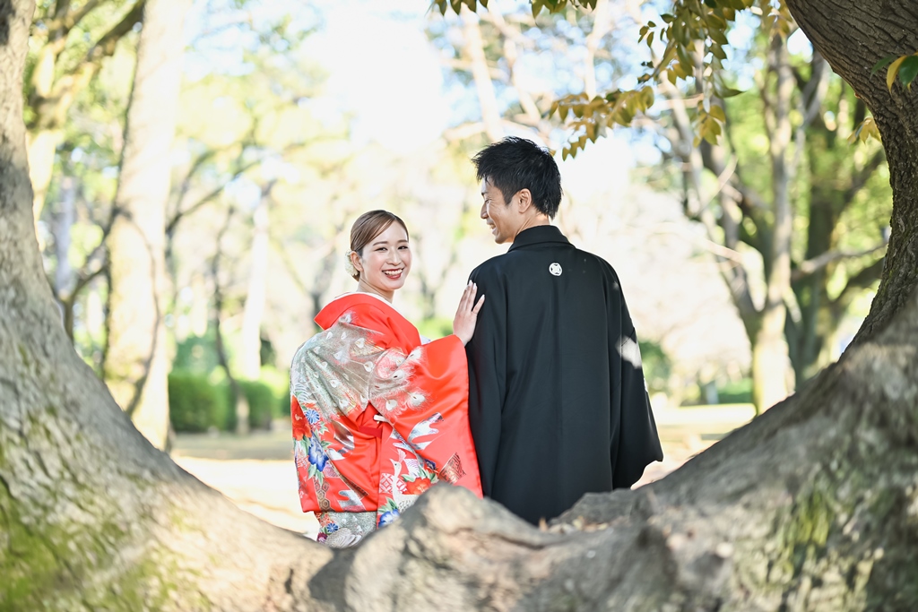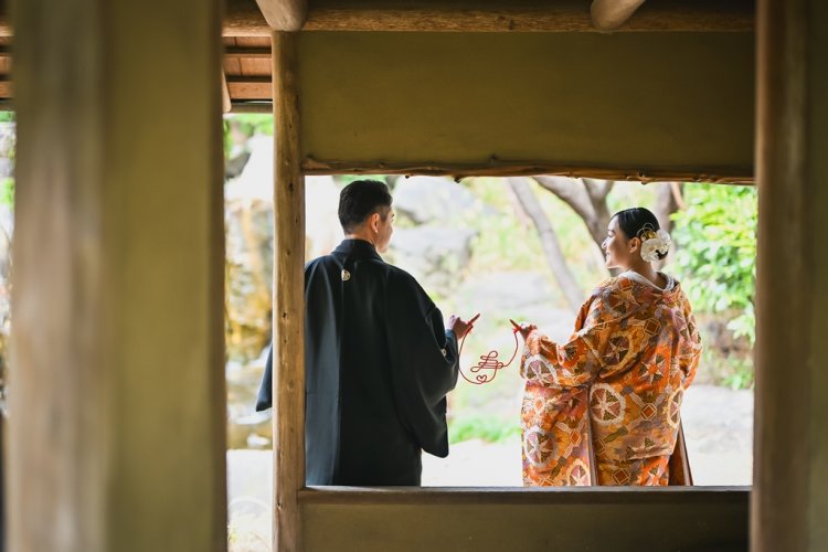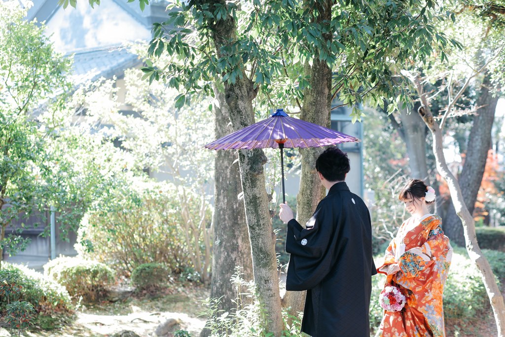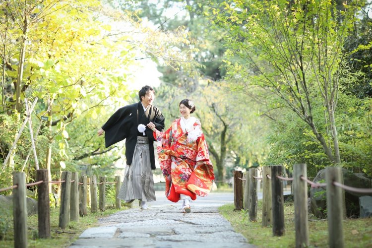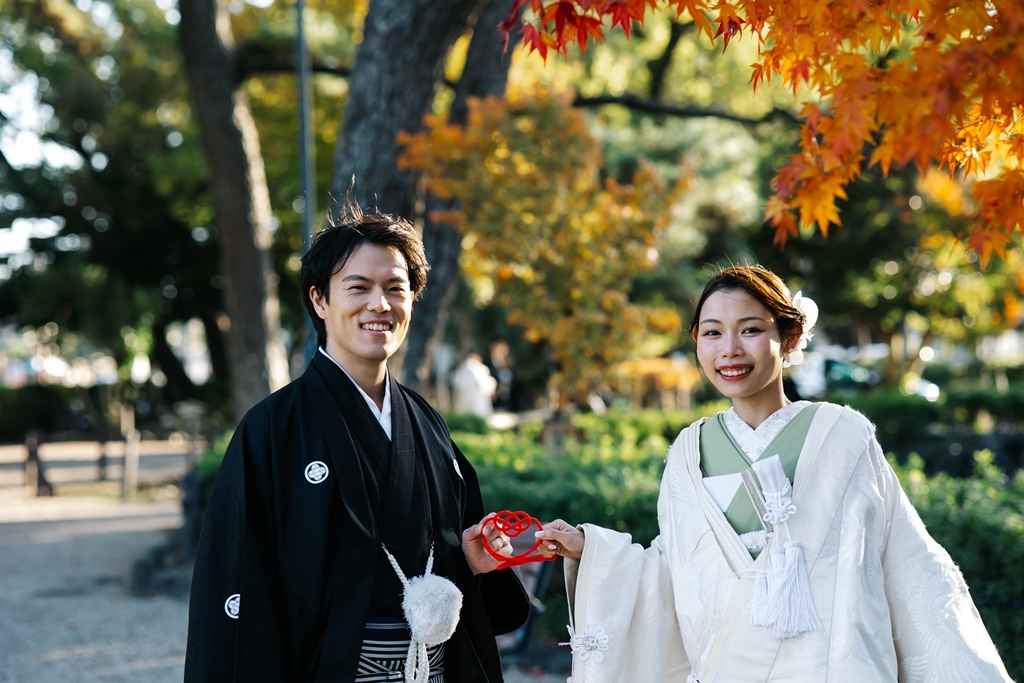庭園での結婚写真は、自然の彩りと和装の華やかさが調和し、一生の思い出となる特別な一枚に。