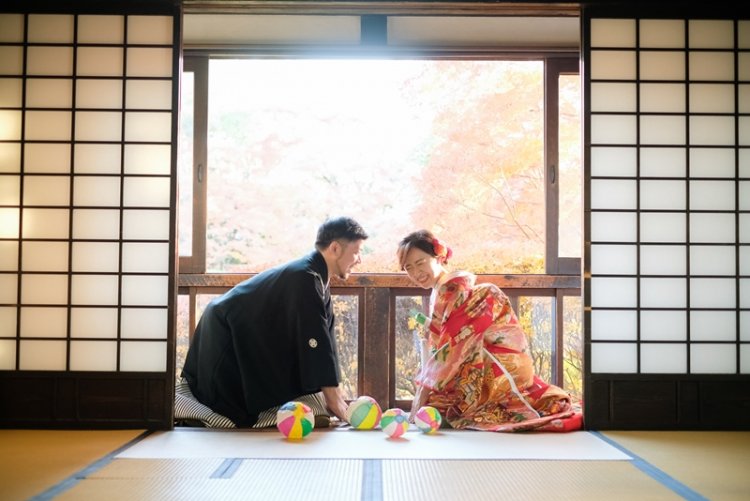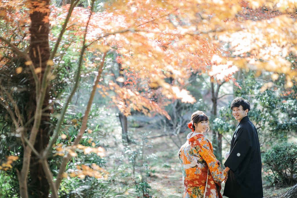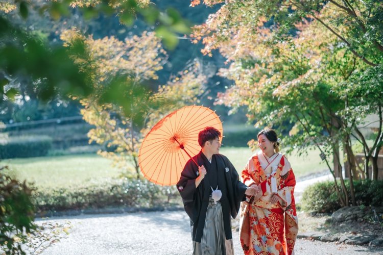 春の桜や秋の紅葉が鮮やかに和装を引き立て、落ち着きある大人の前撮りを希望するカップルにおすすめです。