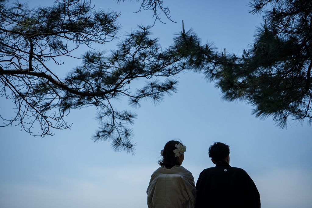和装との相性が抜群で、特に白無垢と城の重厚感ある景観は相まって格式の高い一枚に仕上がります。