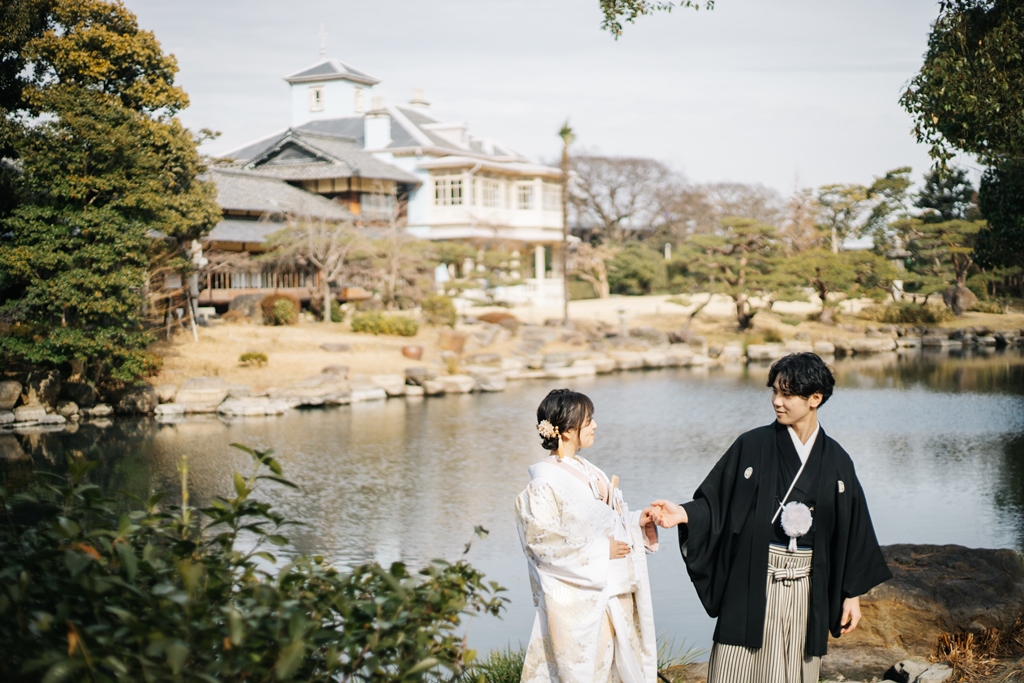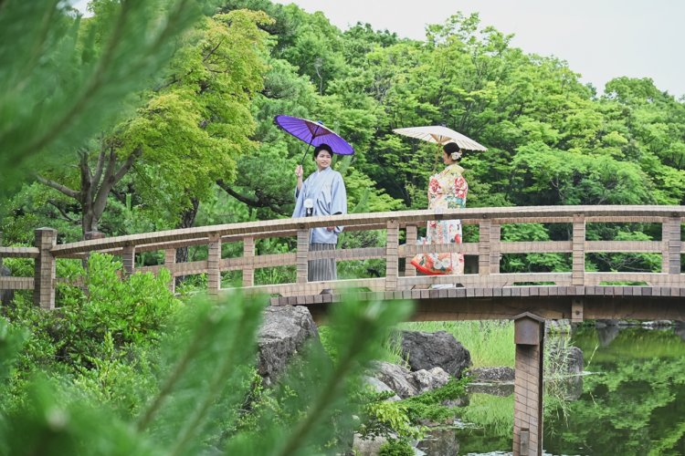 池や緑に囲まれた和の風景はもちろん、モダンな洋館を背景にすることで、和と洋が融合した独特の世界観を演出できます。