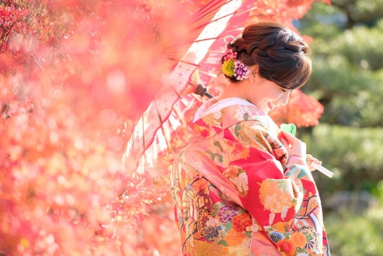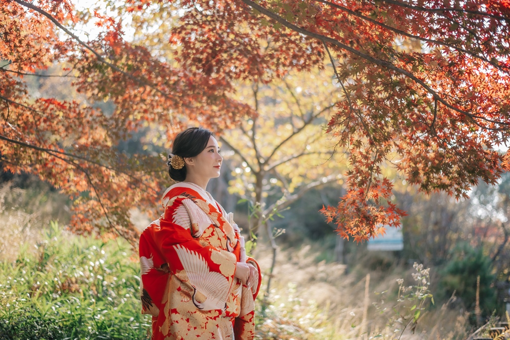 鮮やかな赤や橙に染まった景色を背景にすれば、和装の美しさがより一層際立ちます。
