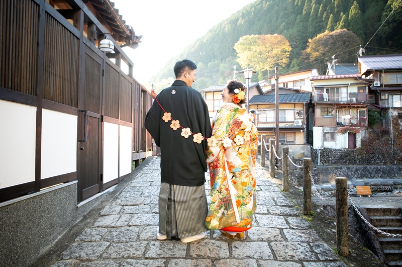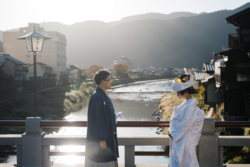 石畳の道や水路、情緒ある町家の景観が和装姿をよりドラマティックに演出します。