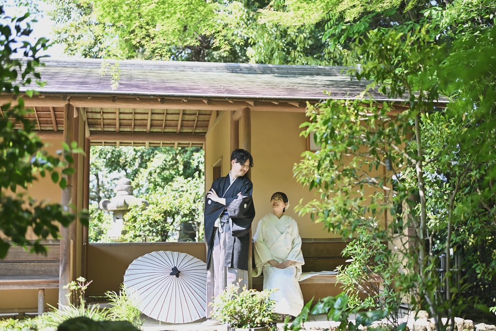 端正な茶室建築と手入れの行き届いた日本庭園が、和装姿を上品かつ凛とした印象に引き立てます。