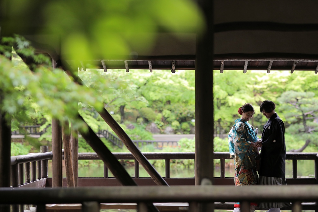 池泉庭園や茶室が揃い、格式ある雰囲気で撮影できます。