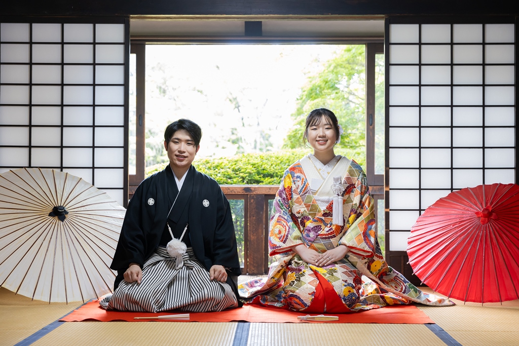 お部屋も一階の和室では囲炉裏で落ち着いた雰囲気を味わえ、二階の窓からは美しい庭園を一望でき、また一階には洋室もあって、色んな背景での撮影が可能です!