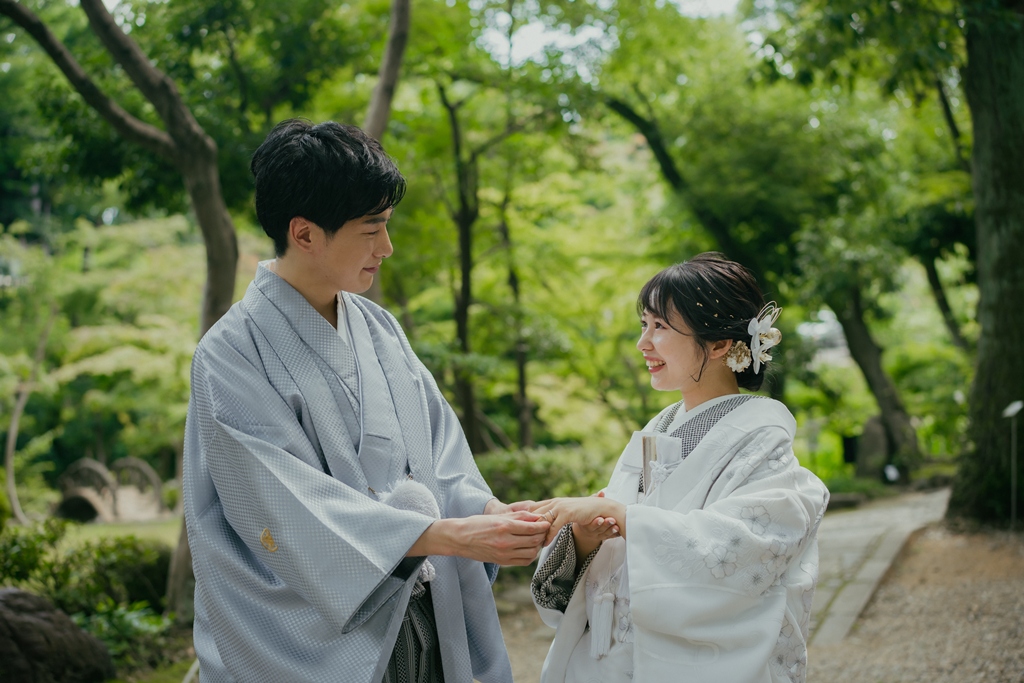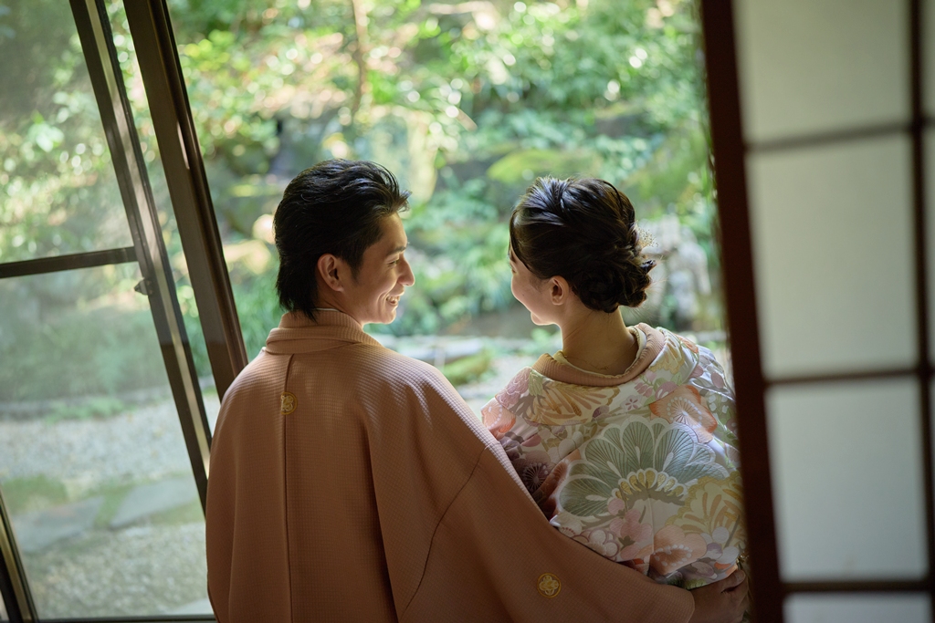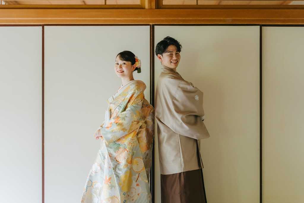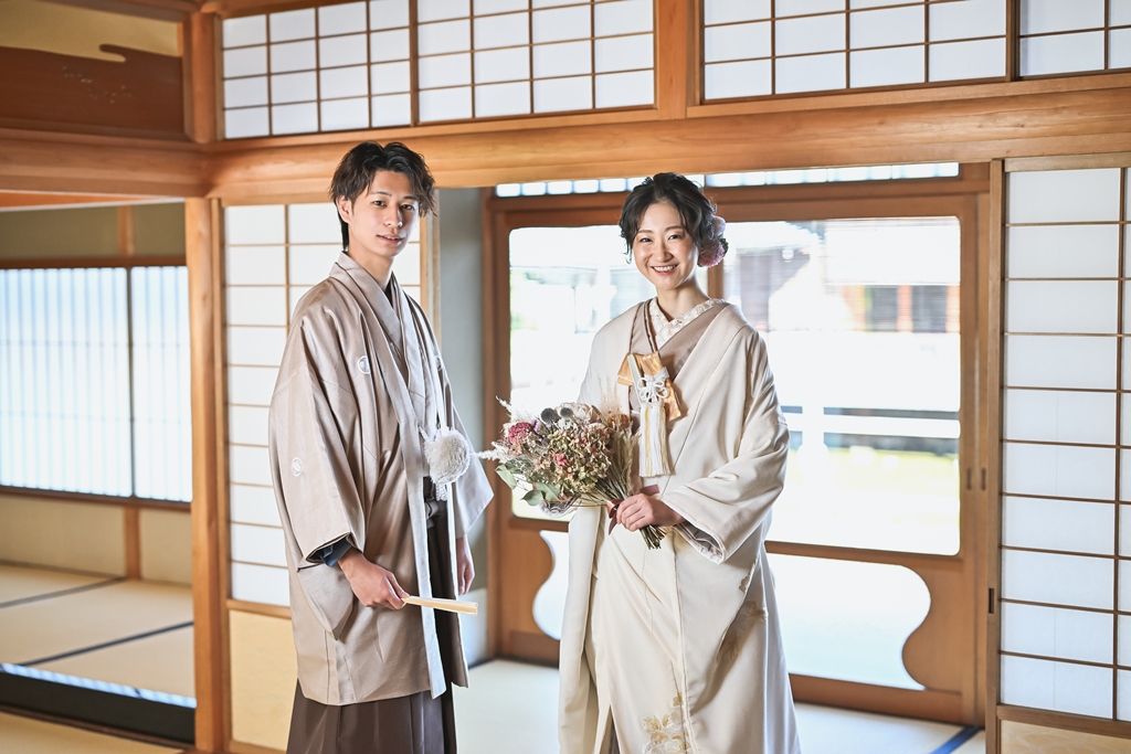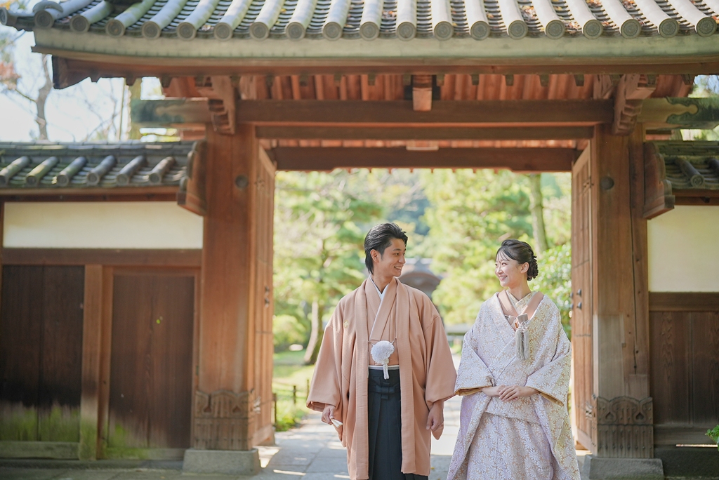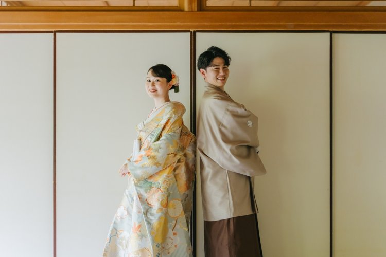 ゴールドベースのバリエーションもあり、花嫁様の個性を華やかに引き立てます。新郎の紋付はアイボリーやカフェオレを合わせると、優しさが加わり、ふたり並んだ姿はまるで春の庭園のよう。
