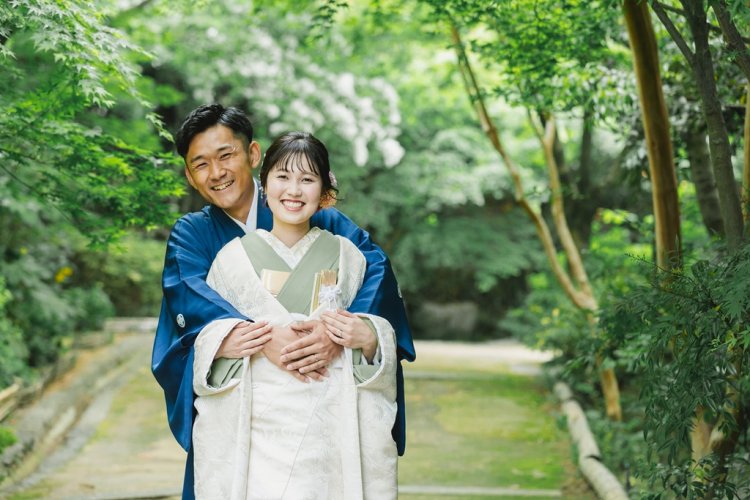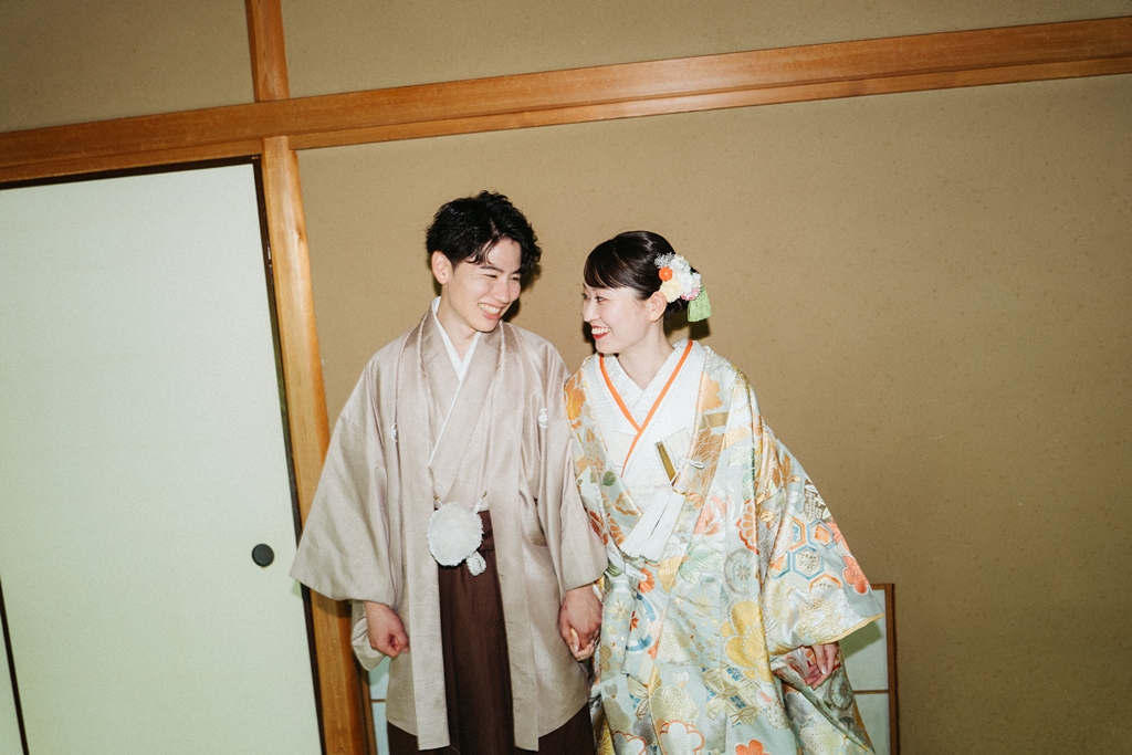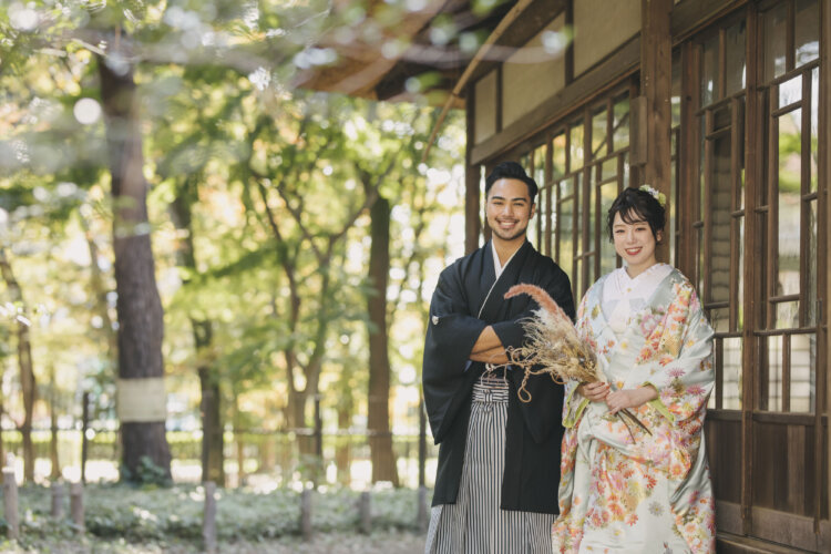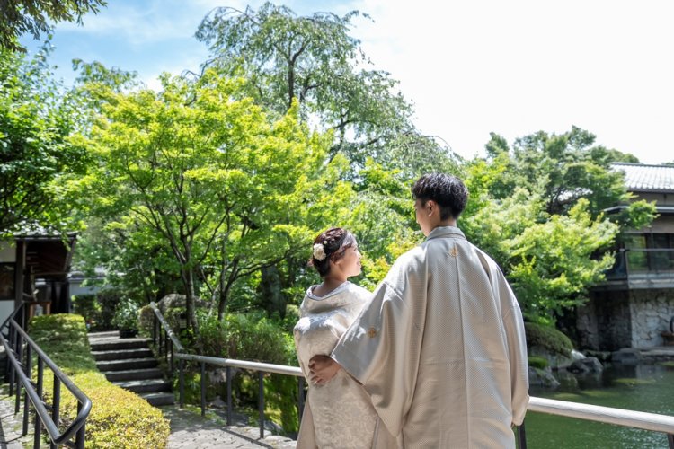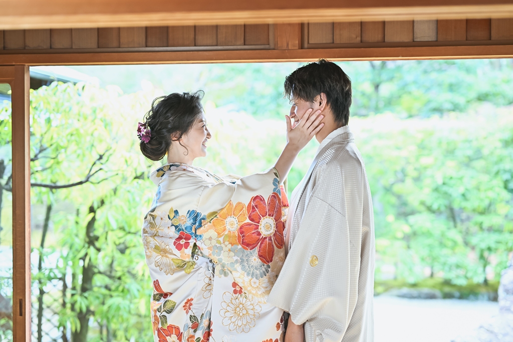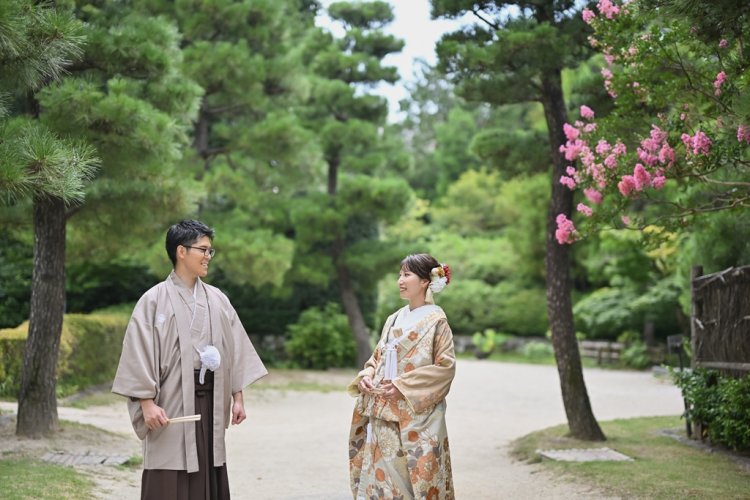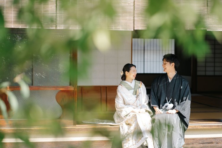 ゴールドベースのバリエーションもあり、花嫁様の個性を華やかに引き立てます。新郎の紋付はアイボリーやカフェオレを合わせると、優しさが加わり、ふたり並んだ姿はまるで春の庭園のよう。