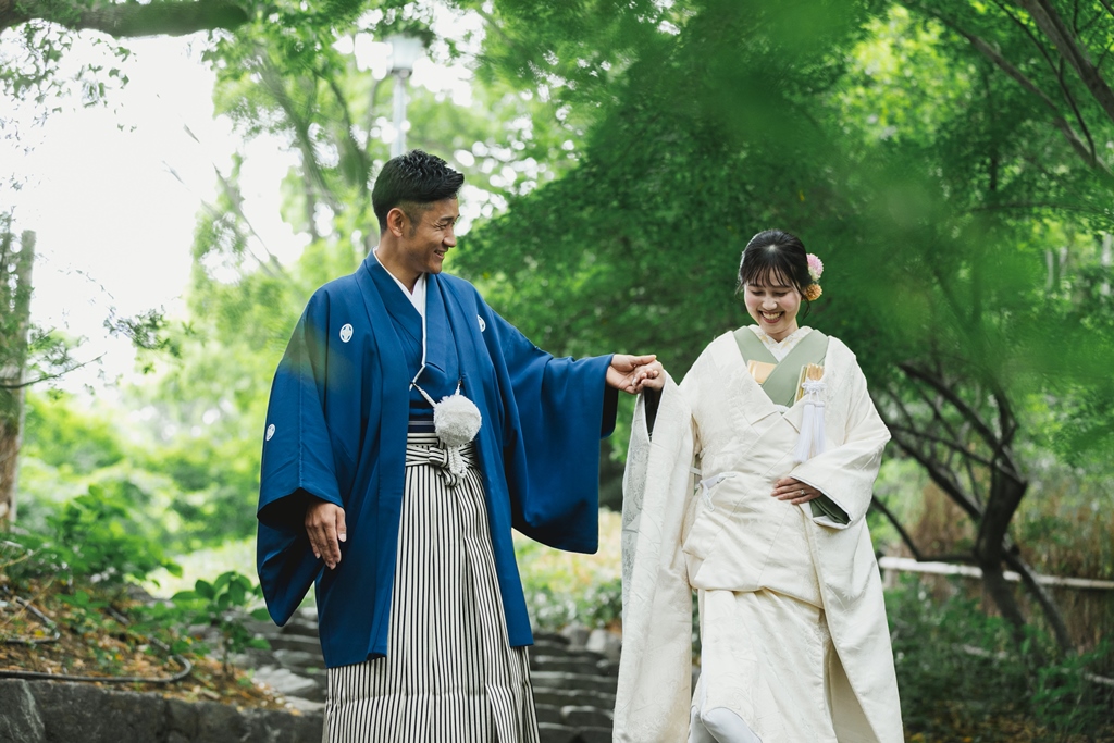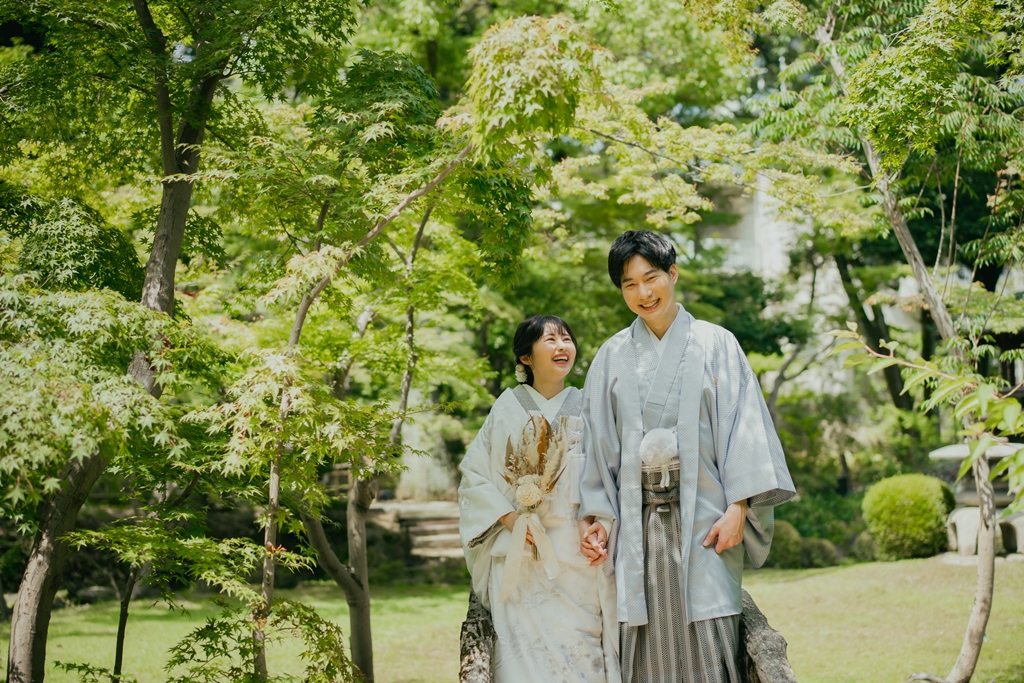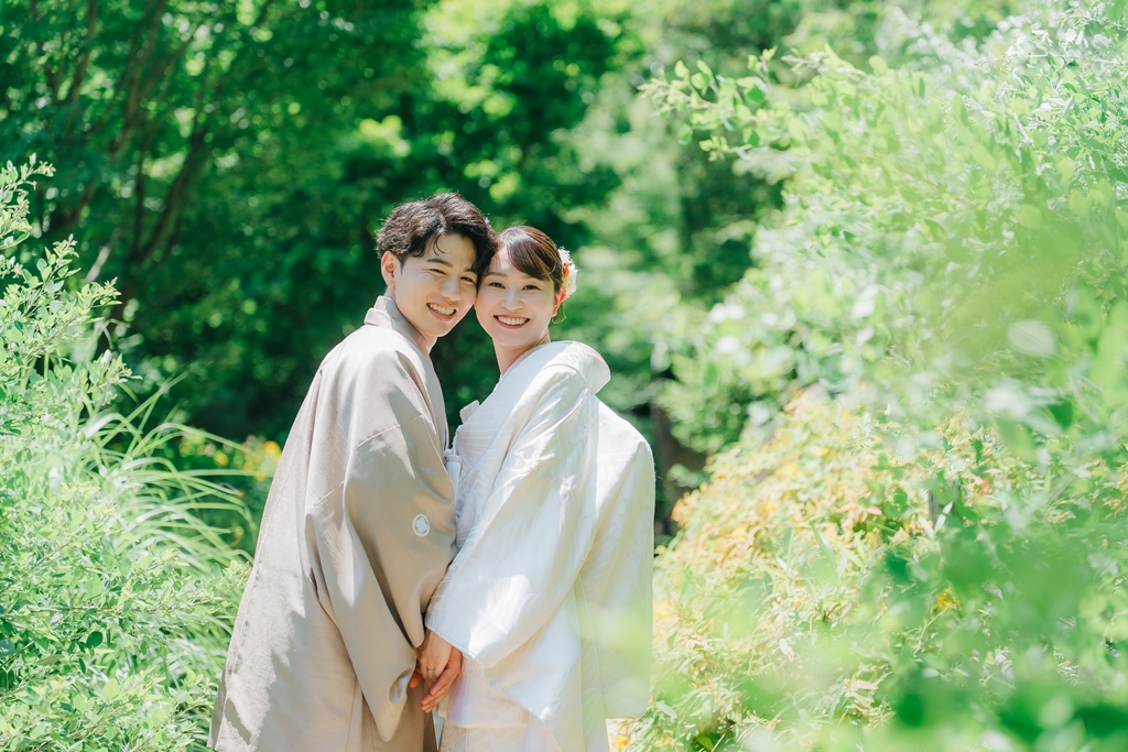 カフェオレカラーの紋付を合わせることで、温もりのある柔らかな印象に。自然光や緑の中で特に映えるため、ロケーション撮影にも最適。ナチュラルで華やかな雰囲気を求める花嫁様から高い支持を得ています。