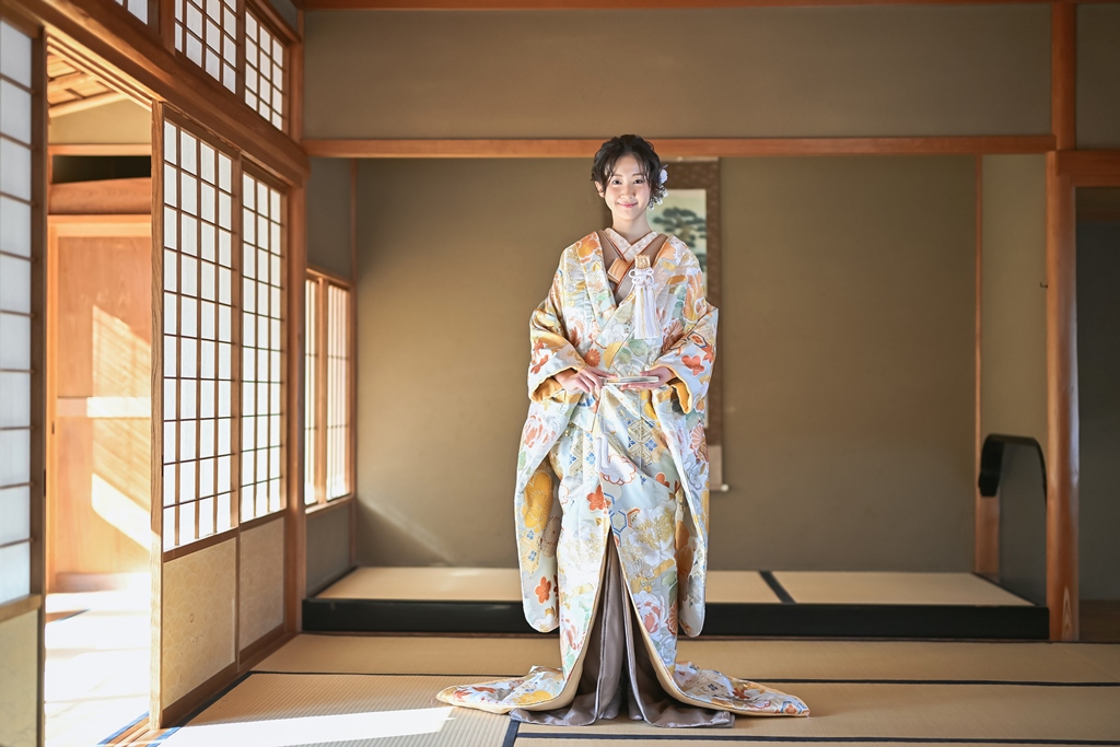 アトリエスタジオはもちろん、お茶室があるロケーションや、洋装でも六華苑などお部屋を借りられる施設でもプチお色直しが可能!