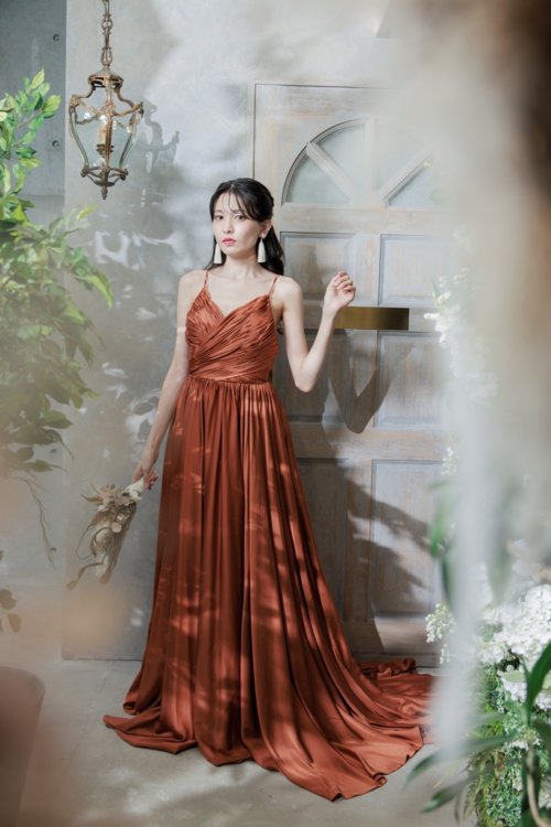 特徴:品のある大人っぽいシックなブラウンの新作ドレス。光沢感のあるドレスで、高級感溢れる上質な衣装です。ドライフラワーブーケがピッタリな1枚です。