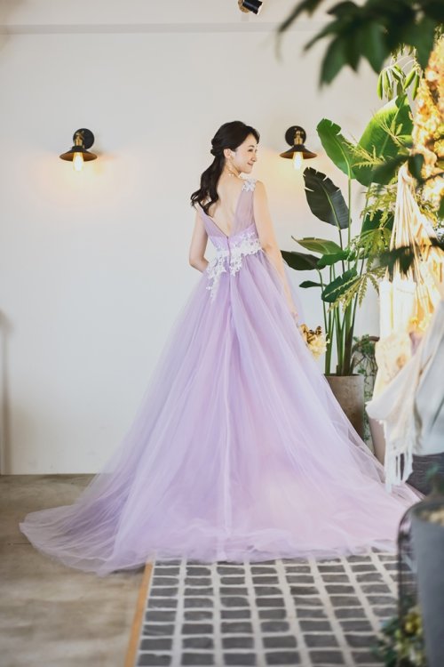特徴:上品な色味のライトパープルのドレス。シンプルなデザインに肩とウェストの刺繍でオシャレに華やかさをプラスしています。大き目にあいた背中のデザインに腰の刺繍でバックスタイルも魅力的!高級感やエレガントな雰囲気溢れるドレスです。