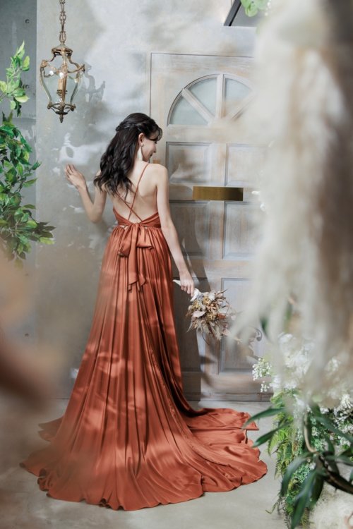 特徴:大人可愛いテラコッタオレンジの新作ドレス。シンプルなラインながらも背中が大きく開いたデザインが目を引きます。バックリボンもキュート♡エレガントな雰囲気溢れるドレスです。