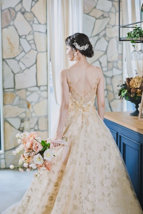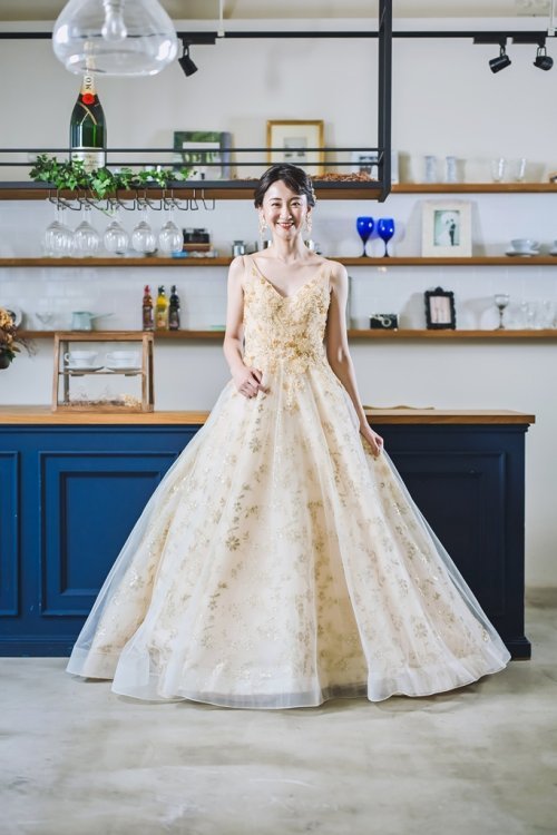 特徴:キラキラと華やかなゴールドの花柄の刺繍とハリのある生地のAラインカラードレス。カラードレスですが優しい色味の為、どんなシーンにでも合う衣装です。肌なじみの良い色合いに綺麗なドレスラインで、上品なブライダルにお勧めのドレスとなっております。
