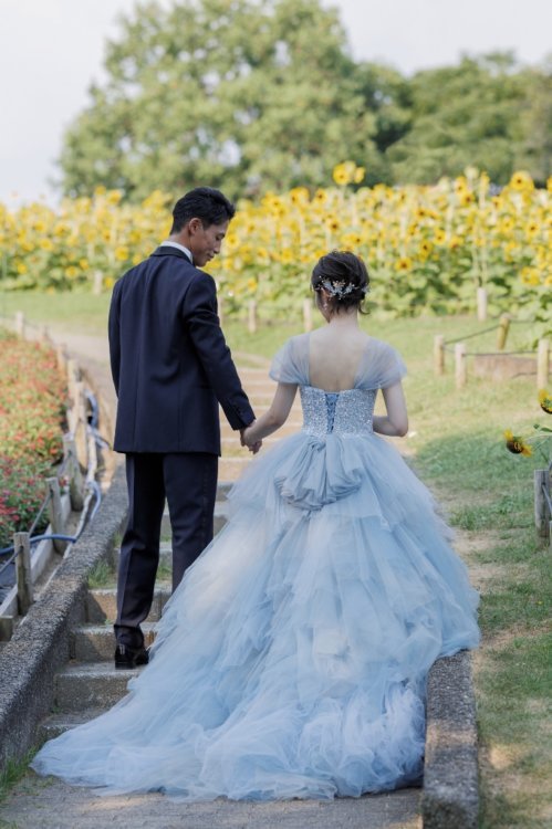 特徴:ミッドブルーのプリンセスラインドレスは、気品と華やかさを兼ね備えた一着。落ち着いた青が肌を美しく引き立て、上品な印象を演出します。