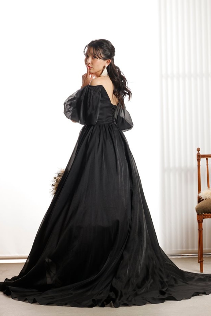 特徴:クラシカルな雰囲気のブラックの新作カラードレス。大人な色味にパフスリーブの組み合わせで、大人な可愛い贅沢な1着。人気のカラー&シルエットの最強のドレスです。