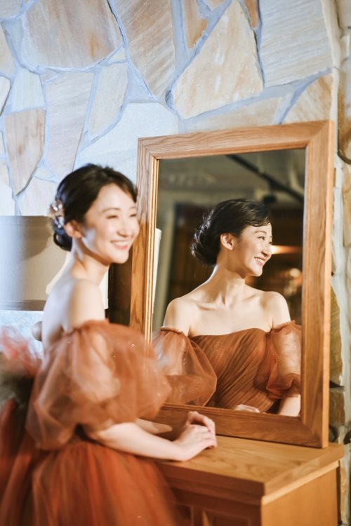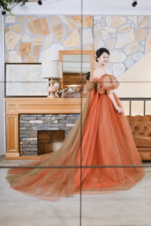 特徴:パフスリーブが印象的なボリューム感のあるテラコッタブラウンのカラードレス。今、大人気のパフスリーブとシフォンの王道ドレスとなっております。後ろのレースリボンも特徴的でとても可愛らしくて人気の1着です!海や緑、洋館とどんなロケーション施設にもお似合いです。