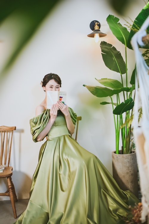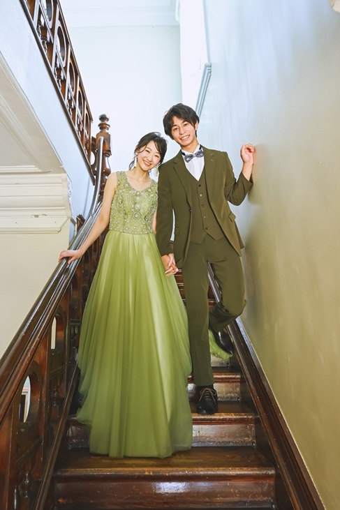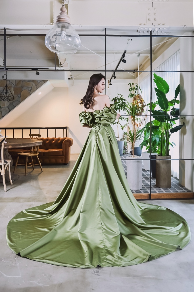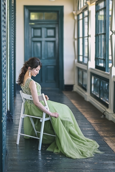 特徴:上半身の刺繡にはキラキラ輝くスパンコールやストーンの装飾が施され、チュールのスカートはボリュームある丈感で上品なモスグリーンのドレス。大人エレガントな雰囲気漂う1枚。洋館はもちろん、自然の中での撮影にもピッタリ!