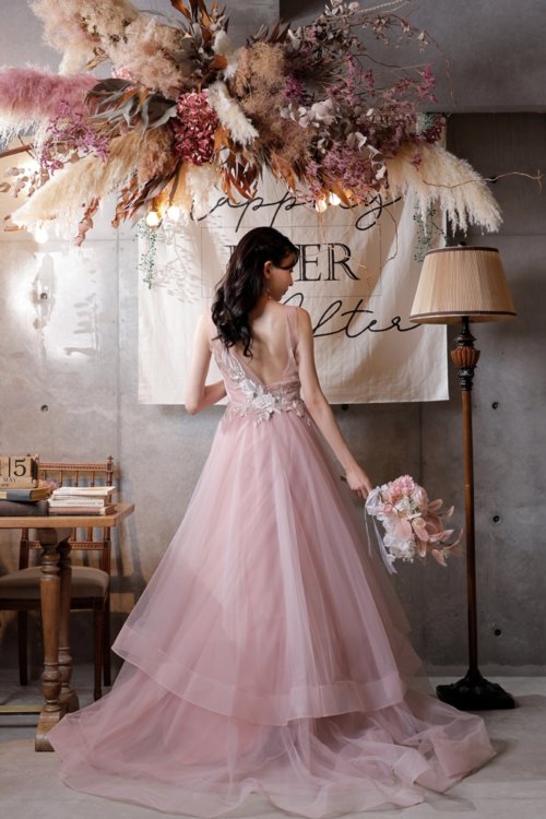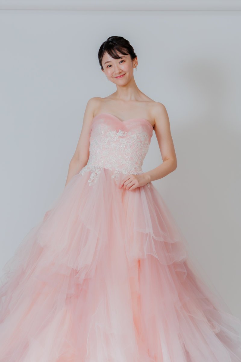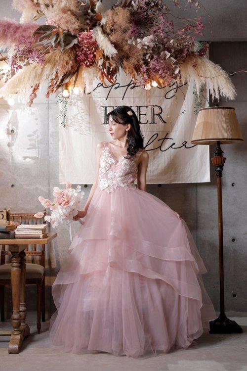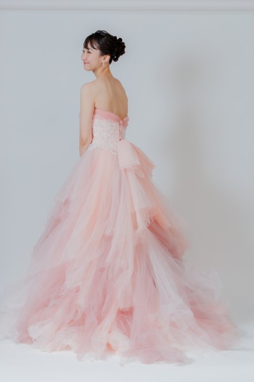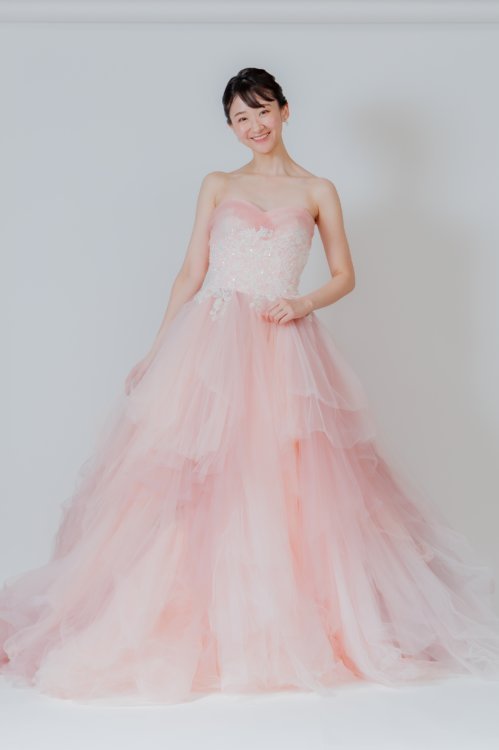特徴:キュートなサクラ色の新作カラードレス。可愛いらしい花柄の刺繍に、幾重にも重ねられたチュールのデザインが魅力的なドレスです。色違いのミントや、ウェディングドレスもお勧めです。