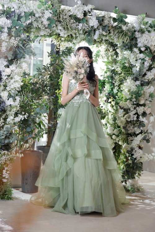 特徴:爽やかな雰囲気のミント色の新作カラードレス。胸元のおおぶりな花柄の刺繍はとても華やかなデザイン。ひらひらと軽やかなスカートで上品な佇まいに。色違いのローズサクラと、ウェディングドレスもございます。