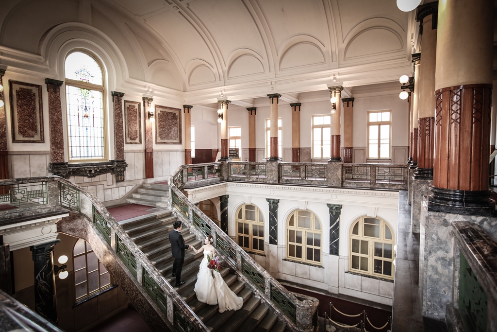 館内には歴史的な重厚感を持つ大階段と、柔らかな光を差し込む美しいステンドグラスは撮影マストスポット。