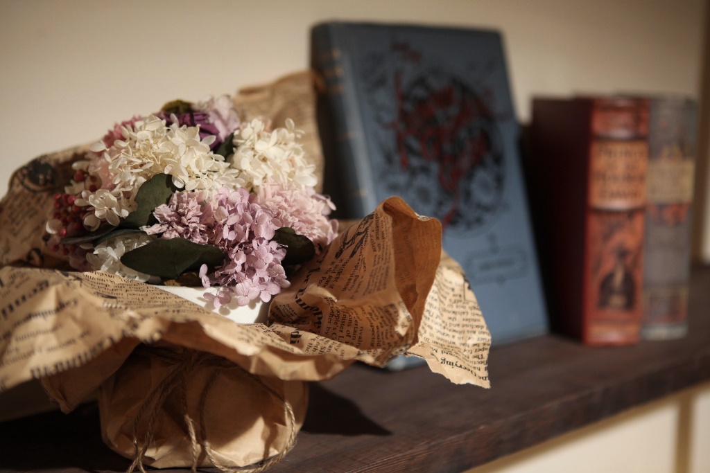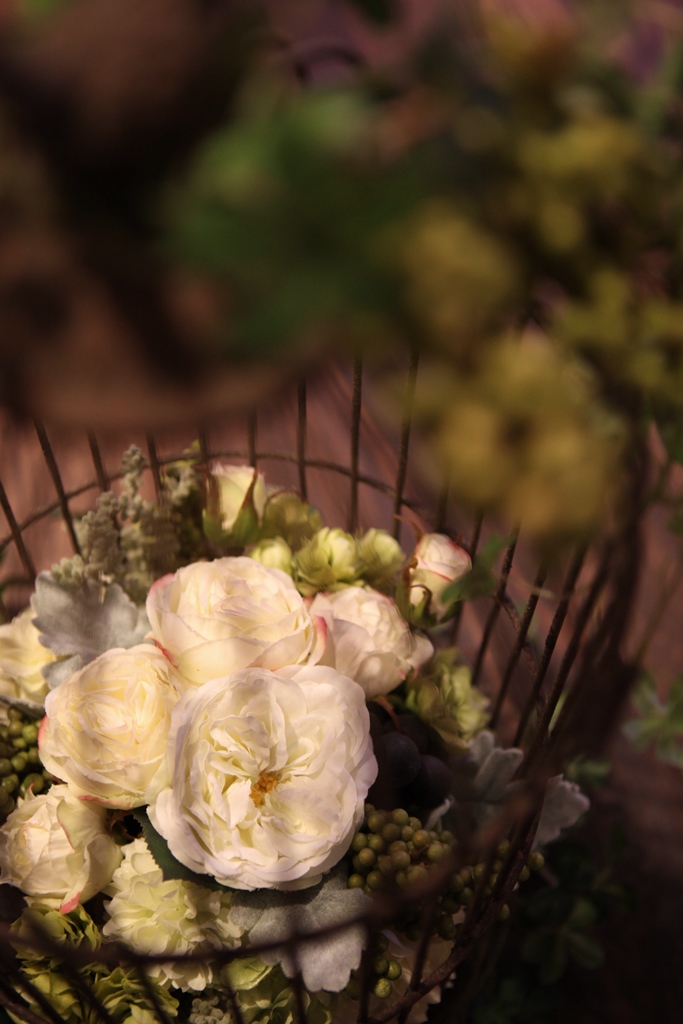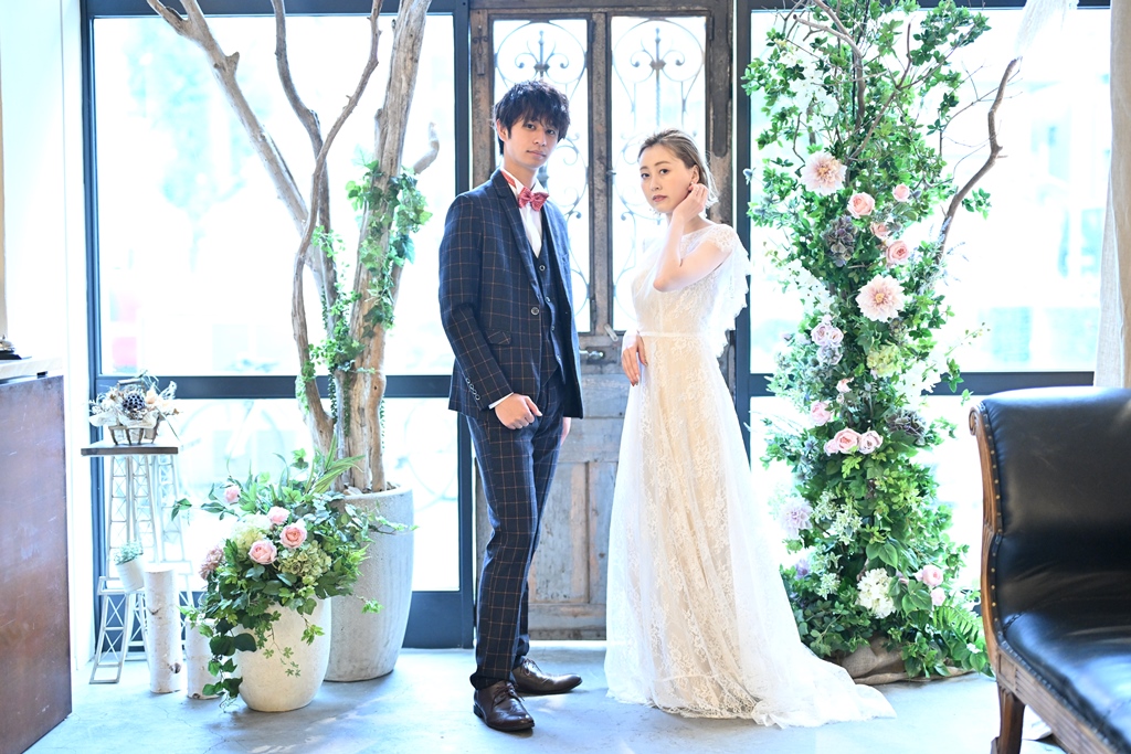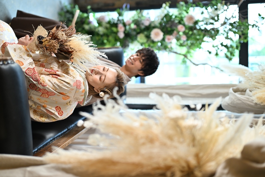 洋装にも和装にも合うドライフラワーアレンジと、どこか懐かしいアンティーク家具のアレンジ、コンクリートにアイボリーのペインティングが施された優しい背景に、ウェディングアベニューならではのオシャレな結婚写真をお撮り頂けます。