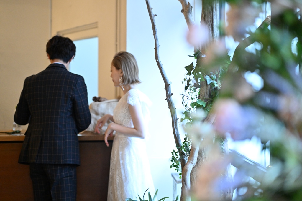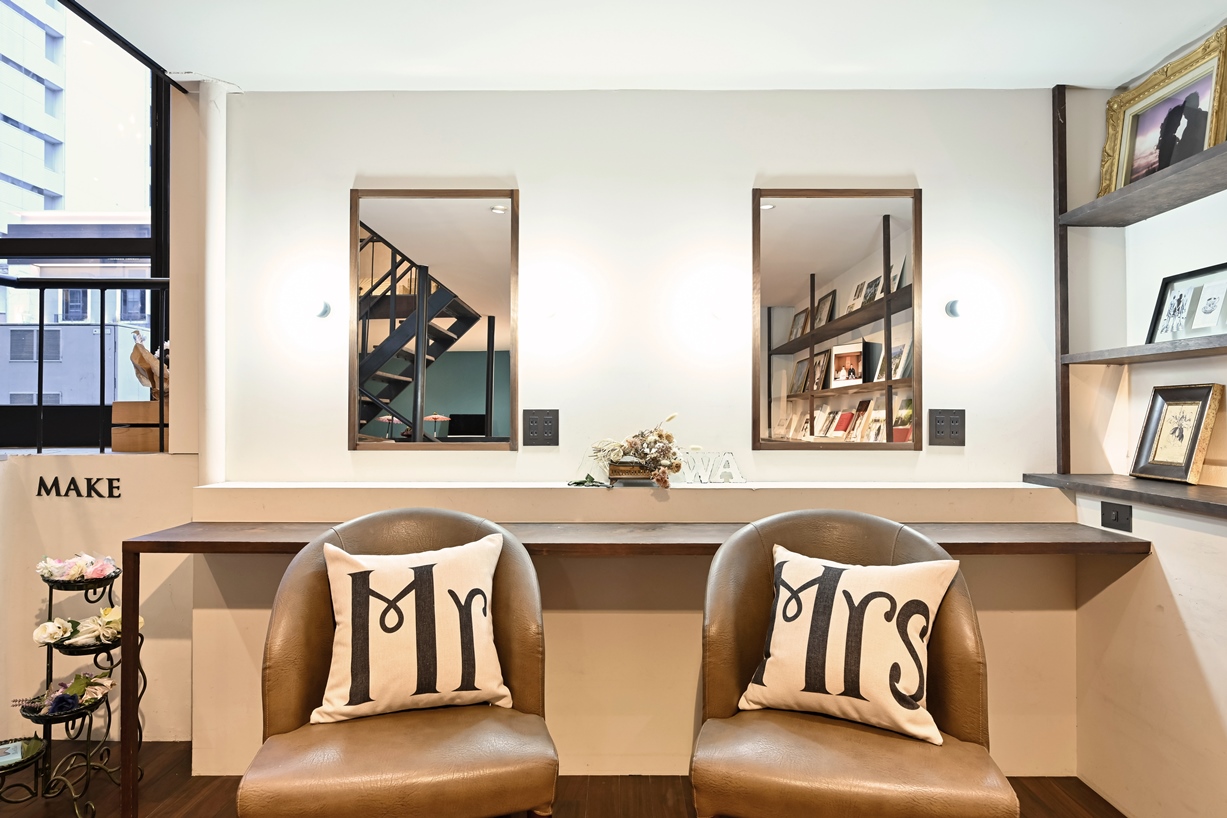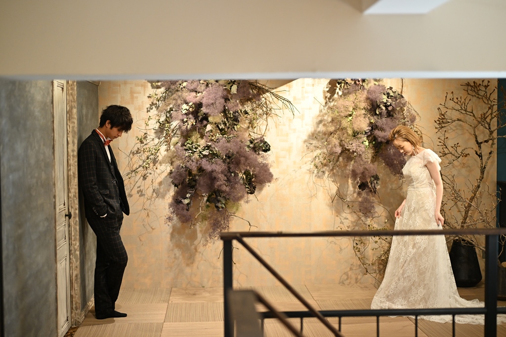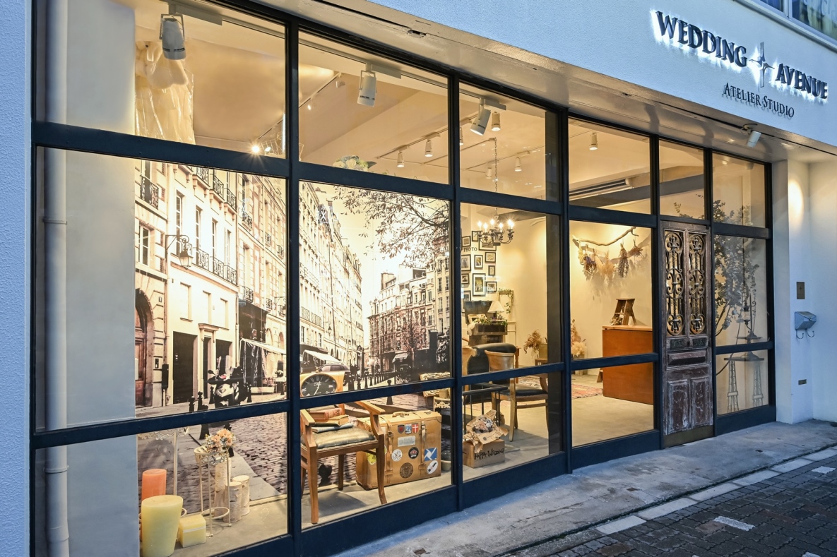ウェディングアベニュー名古屋店は無垢材とコンクリートをベースに、アンティークでオシャレなスタジオです。店内も中二階と半地下のユニークな空間に。アトリエスタジオフォトは大人可愛いが詰まったウェディングスタジオです。