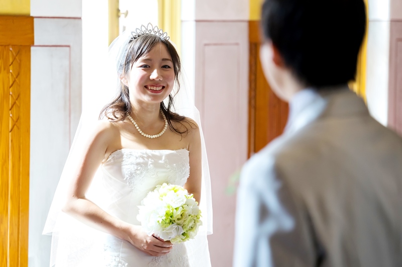 入口の扉前での柔らかい光に包まれてお二人がとても素敵ですね!