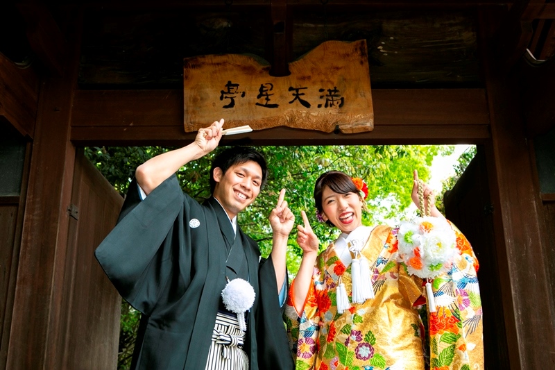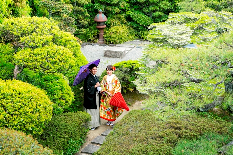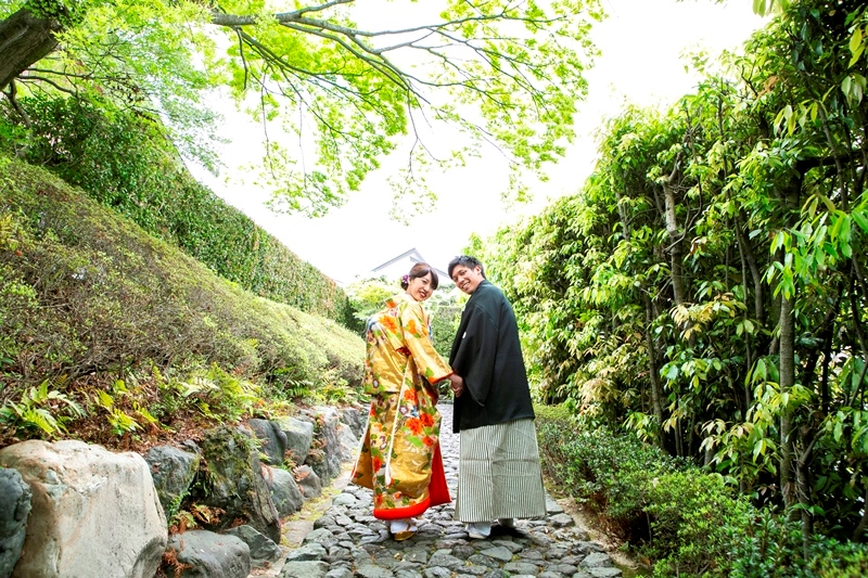 どうだんツツジも生い茂る緑もその中で黒の紋付姿の新郎様、ゴールドの打掛を羽織る新婦様もとっても綺麗ですね。