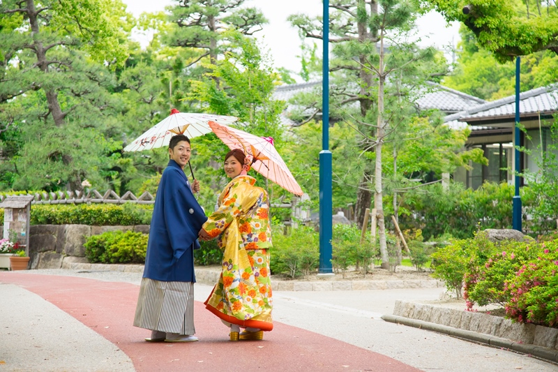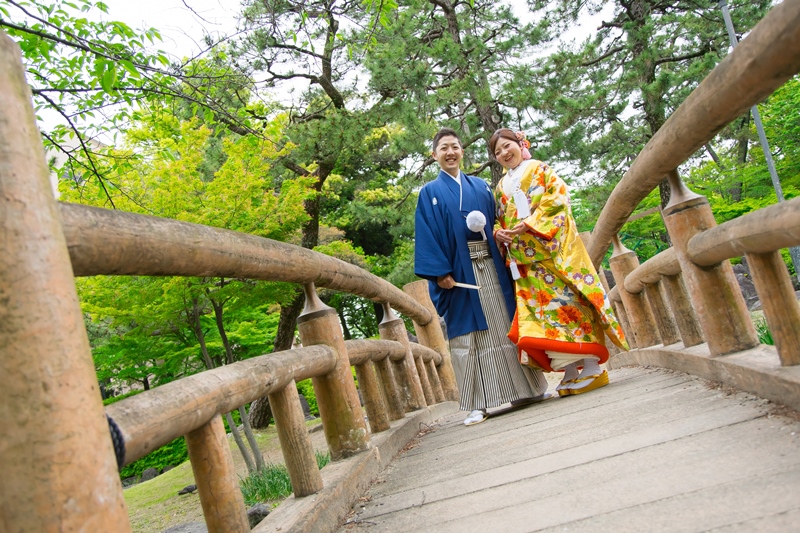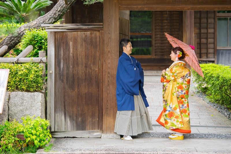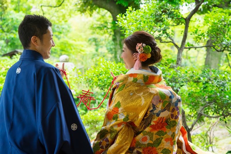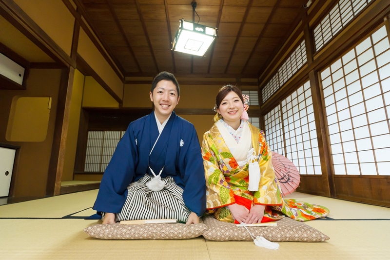 ブルーの紋付姿の新郎様もかっこよく、ゴールドの打掛にかわいい髪飾りの新婦様もとってもキュートです!