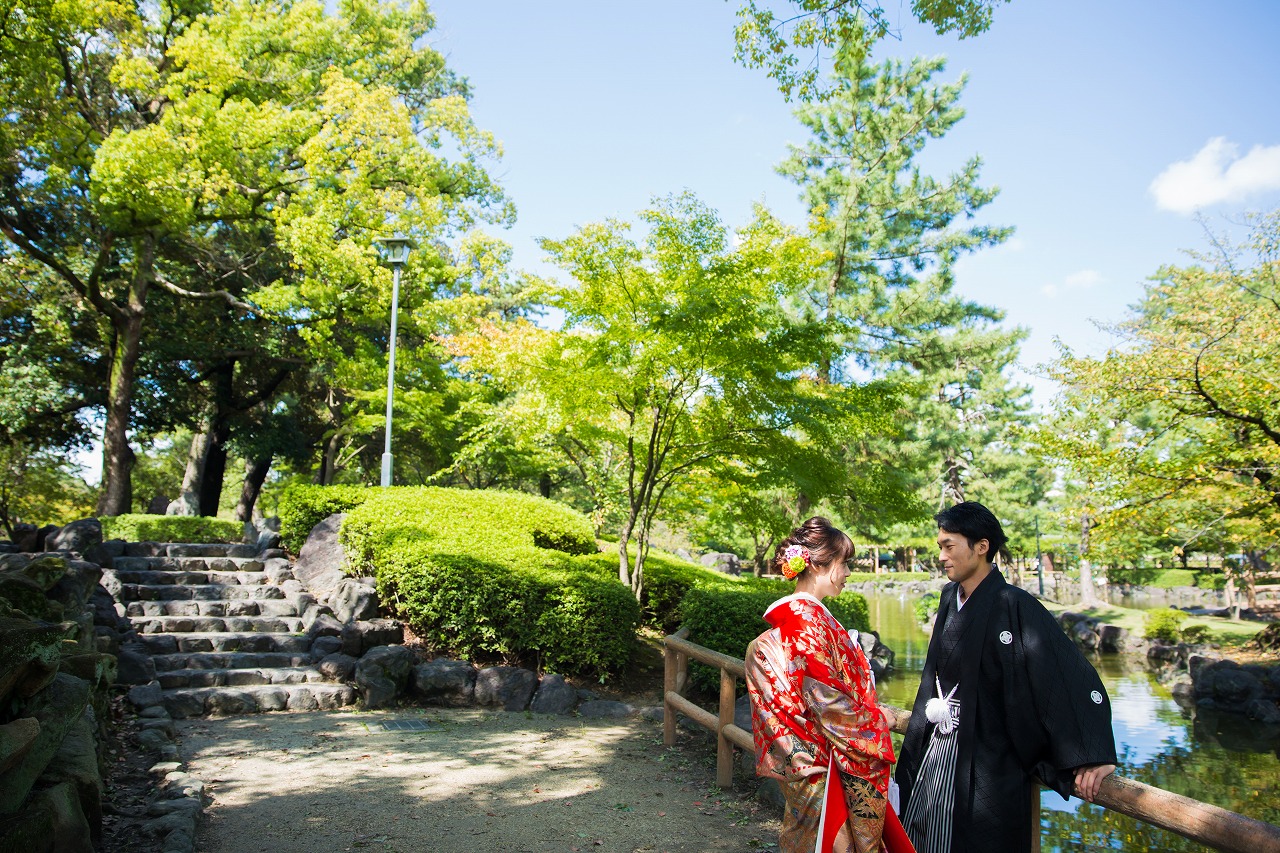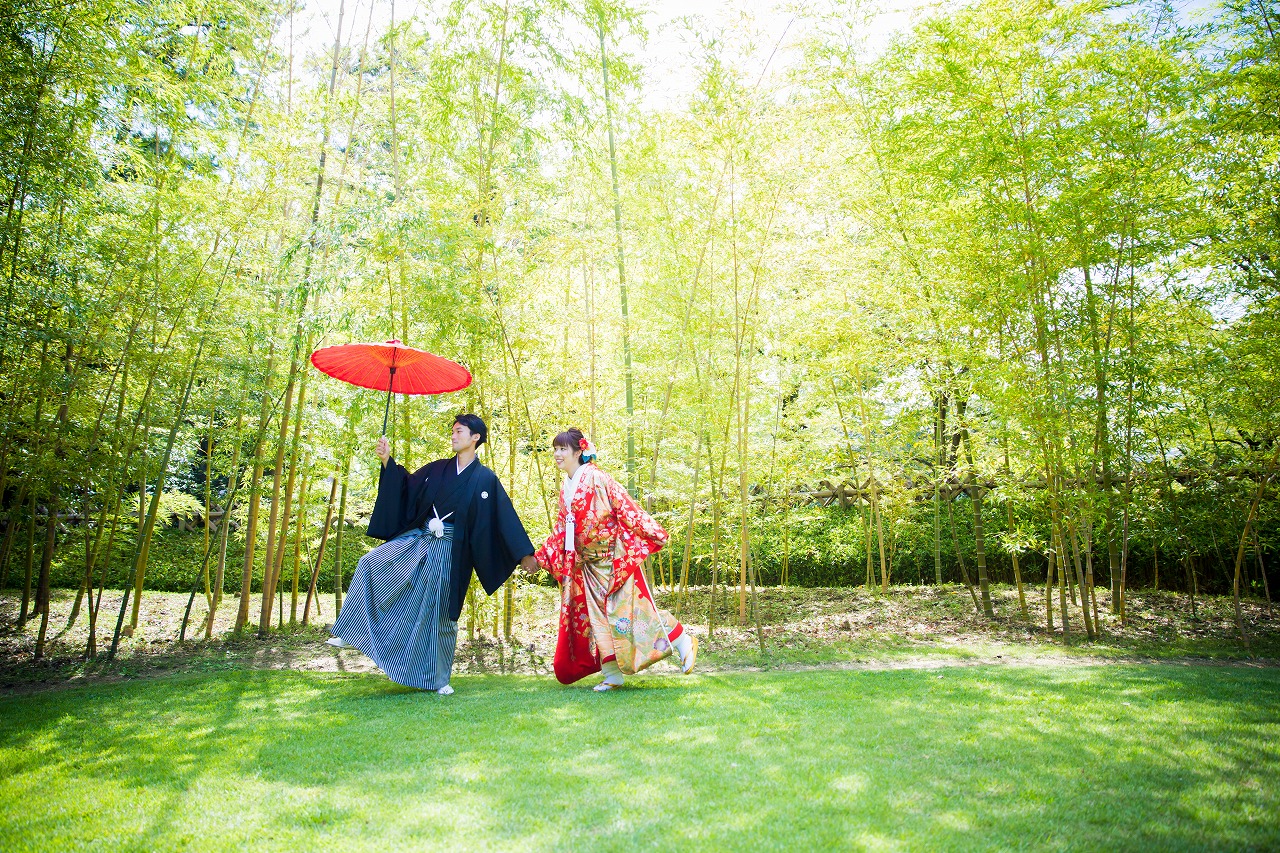 緑の中に赤い色打掛が美しい前撮り