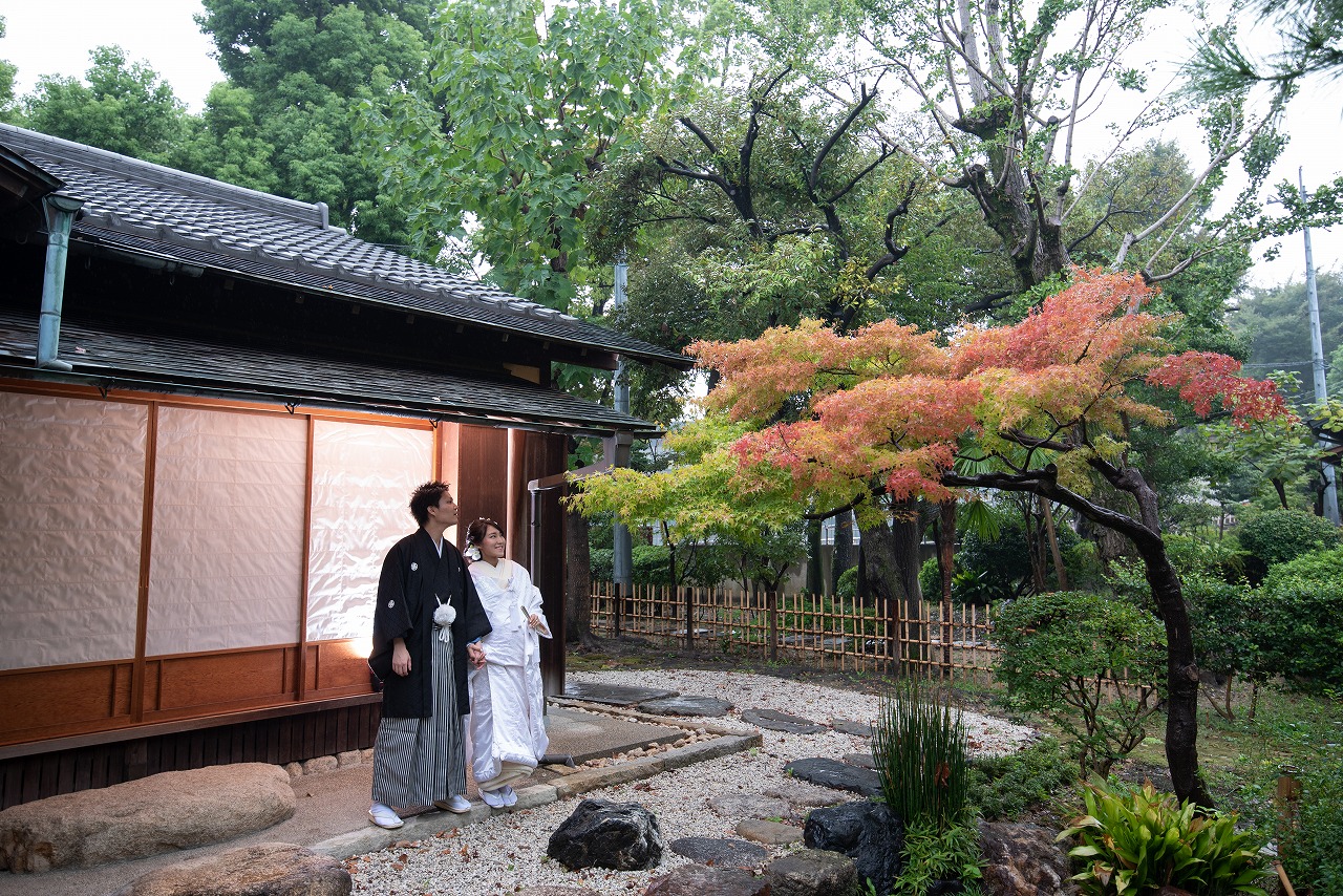 色づき始めた「桐蔭茶席」で和装撮影
