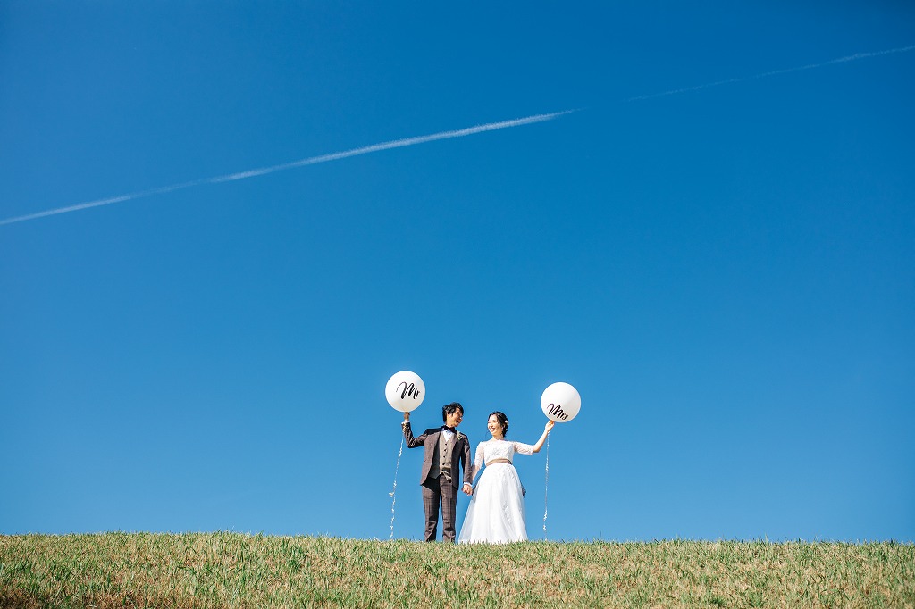 ウェディングドレス、タキシード、ブーケなど様々なものをお二人のイメージに合わせてご用意したオリジナルな撮影。