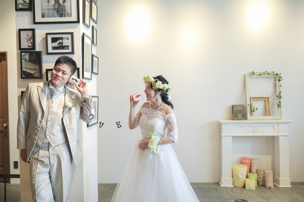 スタジオではアンティークなウェディングドレスで。